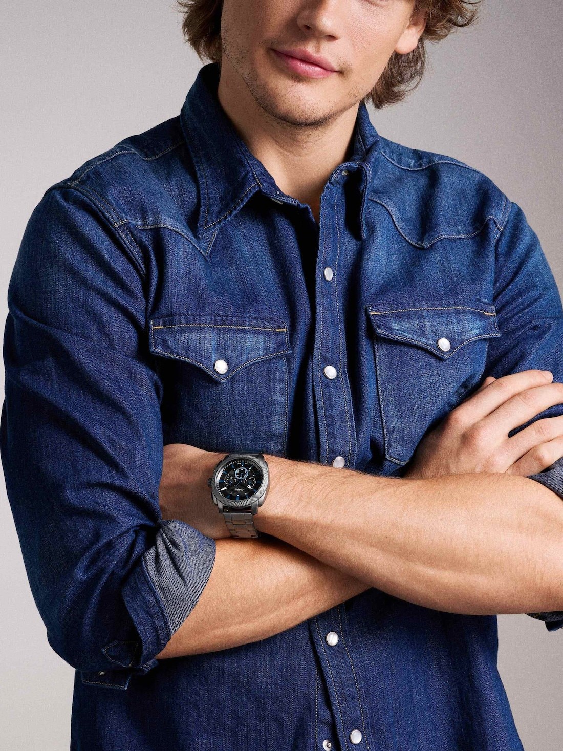 Short Description Inspired by classic American machinery, the Machine Chronograph commands attention with its bold knurled topring. Unmistakably masculine with a bold 44mm case housing a brushed black dial with textured details, all protected by a mineral crystal face. Powered by a precision quartz chronograph movement, this rugged timepiece is built to last with a durable gunmetal stainless steel bracelet. A true statement in industrial-inspired design.