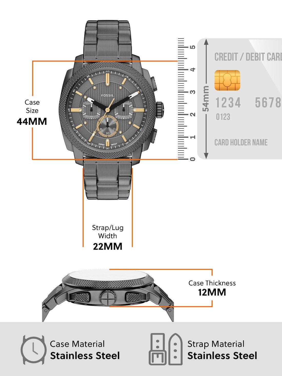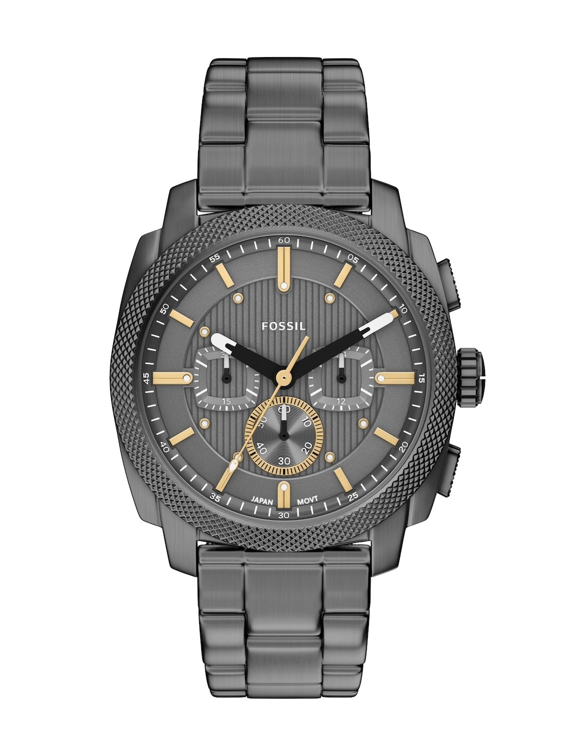 Watch Features fossil, fossil watches for men, men's fossil watches, stainless steel watches for men, gunmetal watches for men, smoke watches for men, quartz chrono watches for men, machine, engraving, japan, japanese movement, men's rugged watches, men's engravable watches