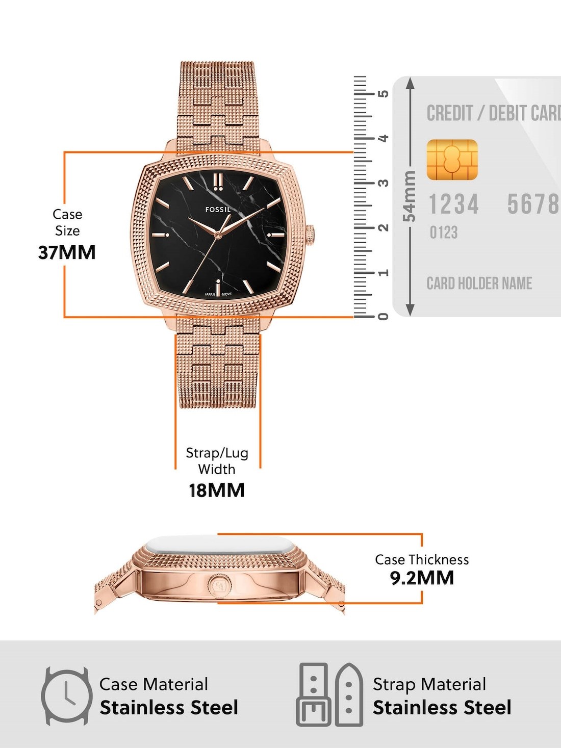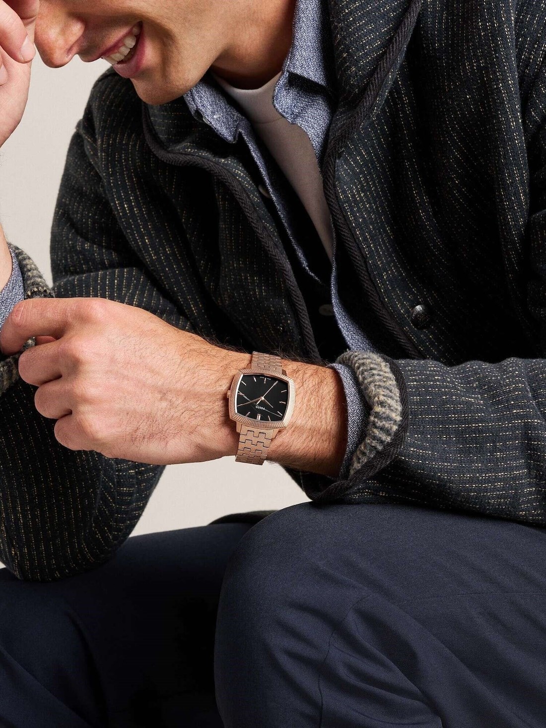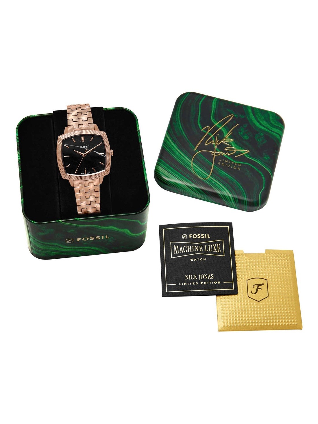 Short Description Designed in collaboration with Nick Jonas, this timepiece is a reimagined take on our bold and bestselling Machine collection. Enter Machine Luxe, featuring a 37mm statement shaped case inspired by Nick's distinct personal style, and a signature knurled bezel characteristic of every Machine watch. In this case, the signature knurling extends to the bracelet for a twist on the classic dress watch. Seen here in rose gold-toned stainless steel with a genuine black marble stone dial. 'It's the use of materials that give this collection a personality,' says Nick. 'Pieces that elevate any look.'
