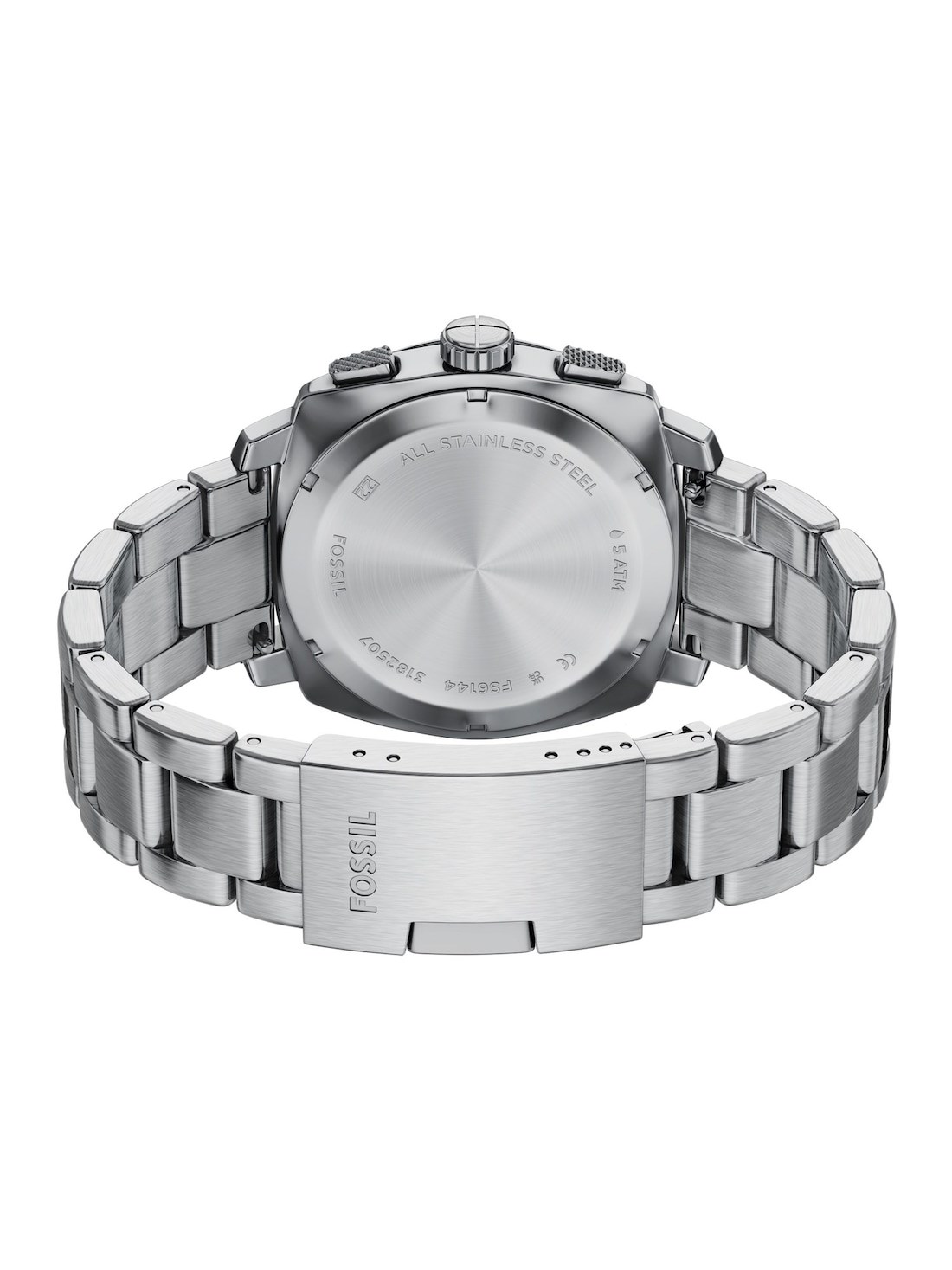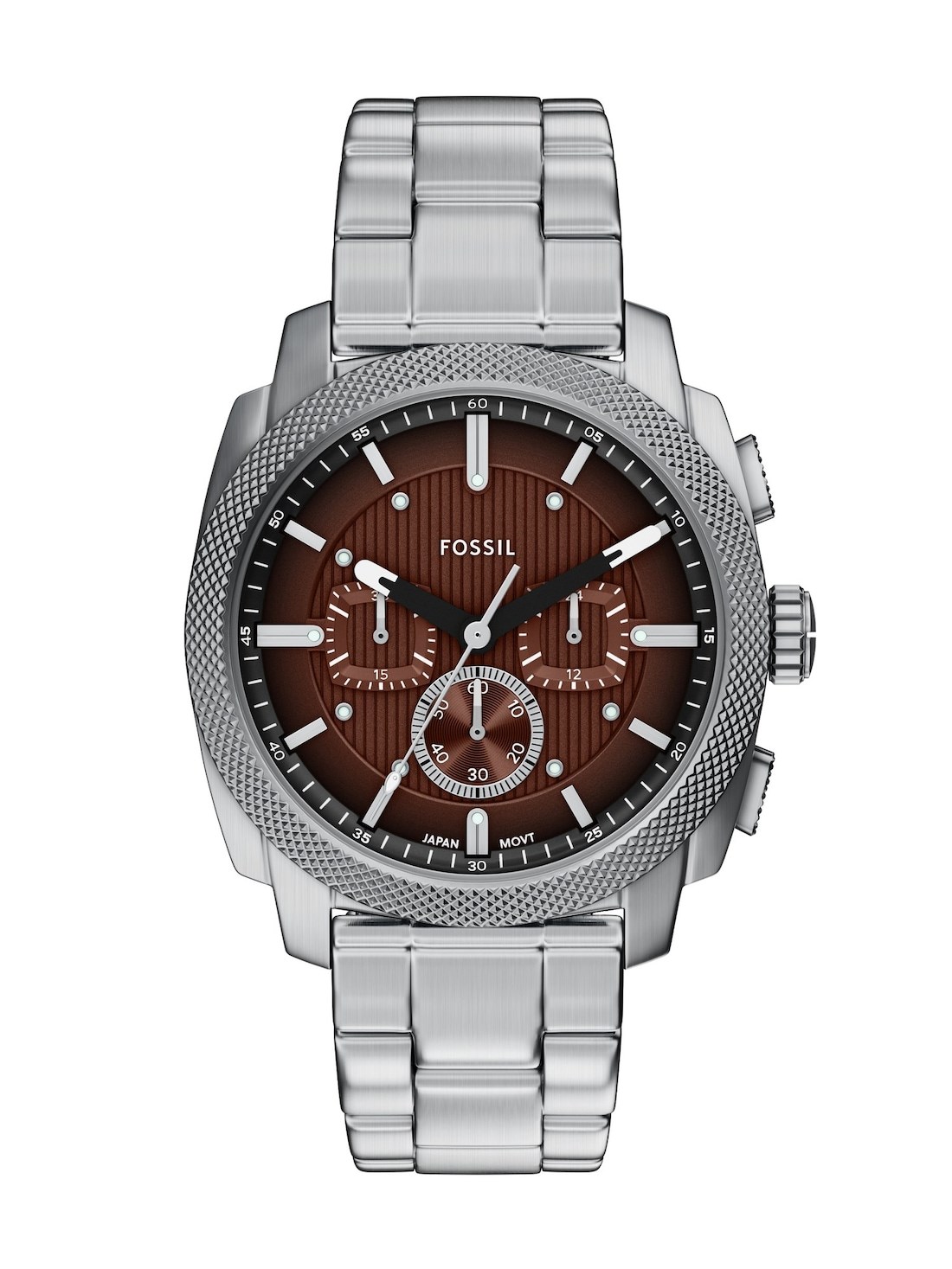 Short Description Inspired by classic American machinery, the Machine Chronograph commands attention with its bold knurled topring. Unmistakably masculine with a bold 44mm case housing a brushed rich brown dial with textured details, all protected by a mineral crystal face. Powered by a precision quartz chronograph movement, this rugged timepiece is built to last with a durable stainless steel bracelet. A true statement in industrial-inspired design.