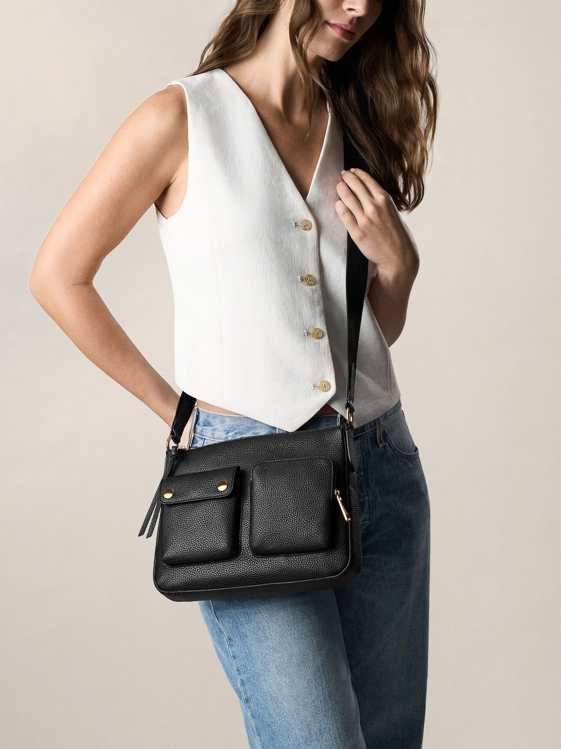 Short Description Crafted from full grain leather, this crossbody is both refined and practical. This versatile shape highlights cargo pockets that not only add style but function as well. It includes a well-organized interior and zipper closure for easy access to essentials. An adjustable strap allows for universal wear, while hardware details complete the look with a clean, modern aesthetic.