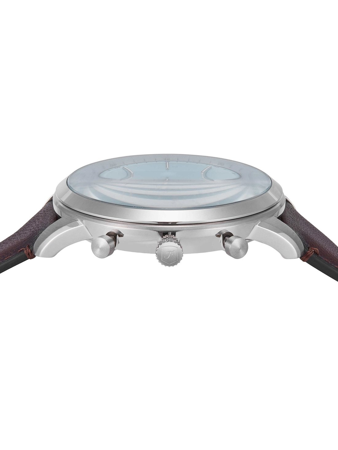 Short Description Incorporating elements from Mid-Century architecture, this chronograph features a well-balanced construction, decorated with a minimal blue sunray dial and sculpted case. A domed mineral crystal and precise Japanese movement lend this standout timepiece both precision and iconic style. Fossil leather products support responsible manufacturing via the Leather Working Group.