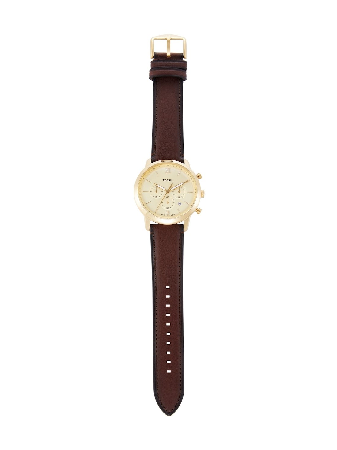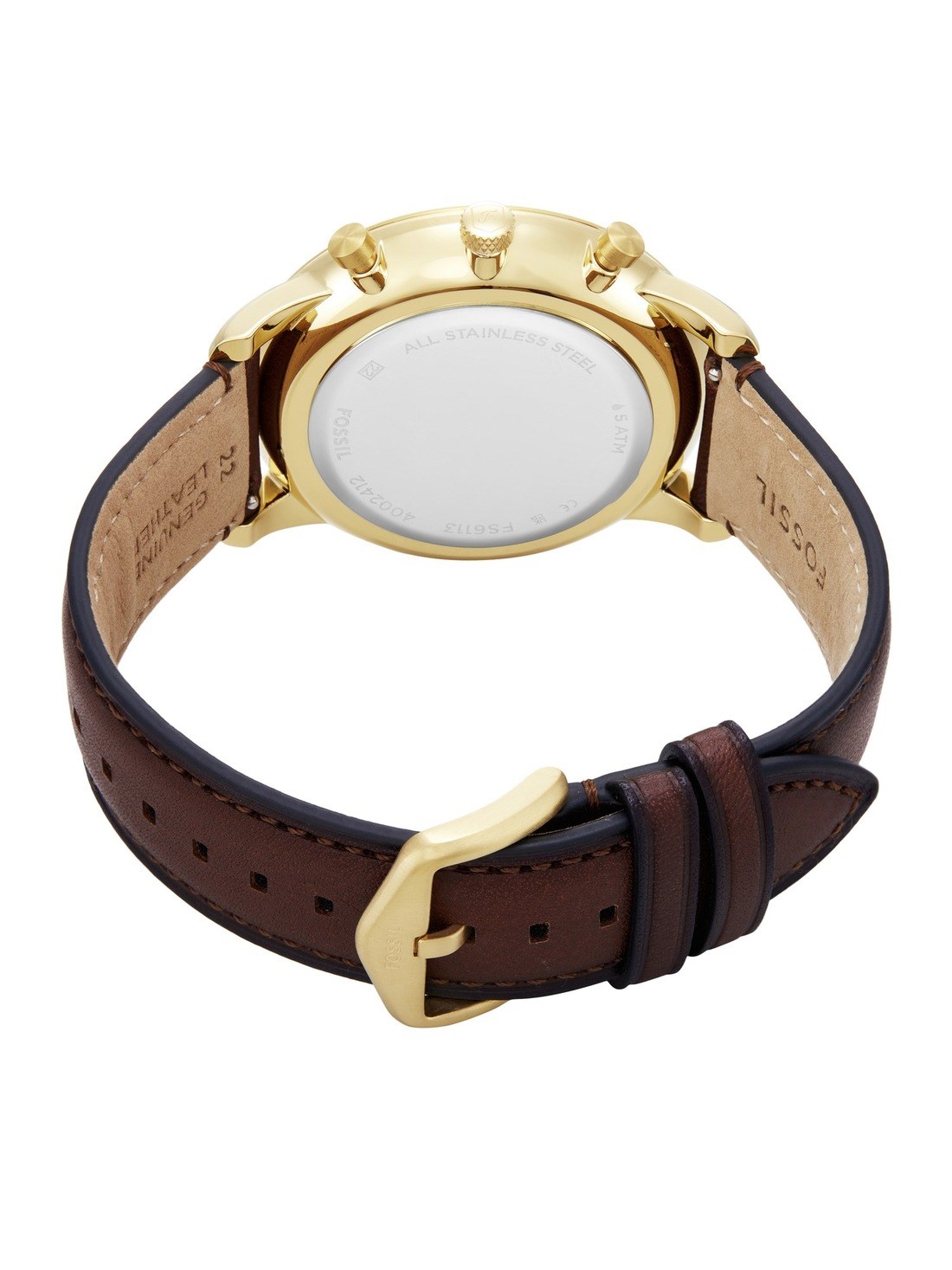 Short Description Incorporating elements from Mid-Century architecture, this chronograph features a well-balanced construction, decorated with a minimal champagne sunray dial and sculpted gold-tone stainless steel case. A domed mineral crystal and precise Japanese movement lend this standout timepiece both precision and iconic style. Fossil leather products support responsible manufacturing via the Leather Working Group.