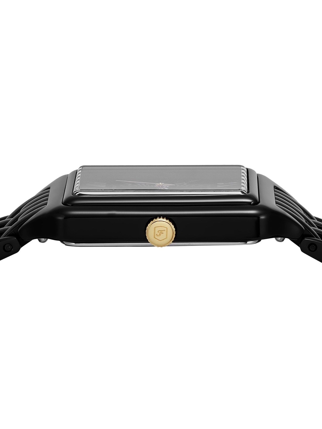 Short Description An icon from our archive, the rectangular Raquel watch is updated with stunning details. Slim and versatile, it features a polished black dial, three-hand date movement and a polished black stainless steel seven-link bracelet.