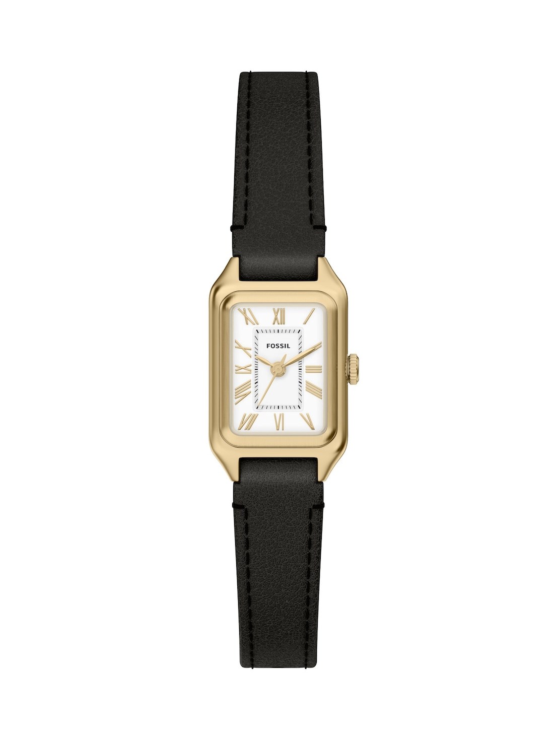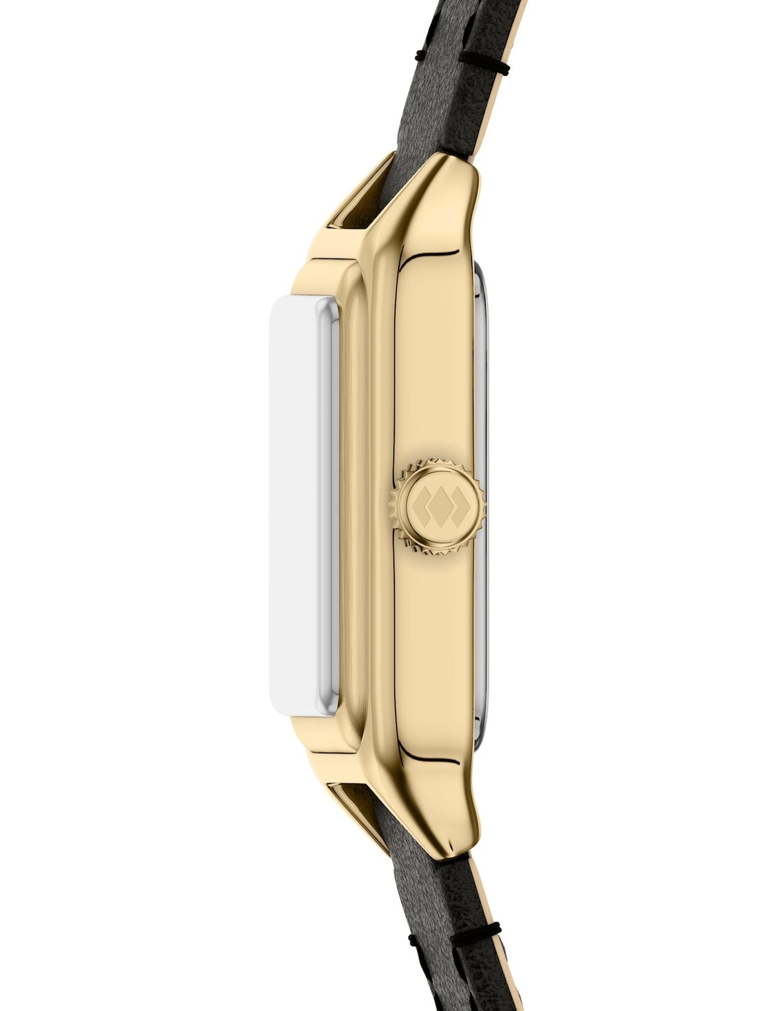 Short Description A small gold-tone rectangular case frames a clean white satin-finished dial with a streamlined three-hand design. The black leather strap adds a subtle contrast and secures with a single prong buckle for easy adjustability.