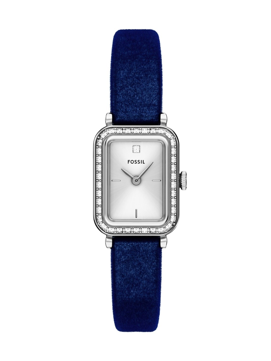 Short Description A silver-tone rectangular case pairs with a navy velvet fabric strap for a clean, understated look. The silver sunray dial adds subtle texture and contrast, featuring a two-hand movement for streamlined timekeeping.