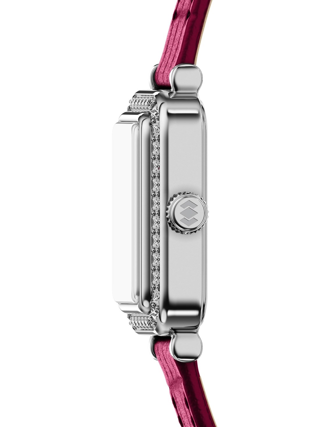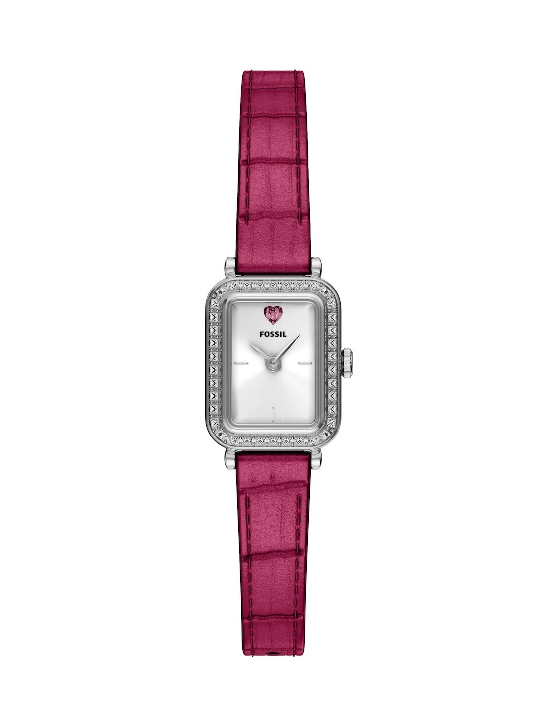 Short Description A silver-tone rectangular case frames a sleek silver sunray dial, creating a refined balance of texture and shine. A red heart-shaped stone on the dial adds a charming, distinctive touch that makes this watch truly special. The smooth pink leather strap lends a soft, understated finish, secured with a single-prong buckle for easy adjustability.