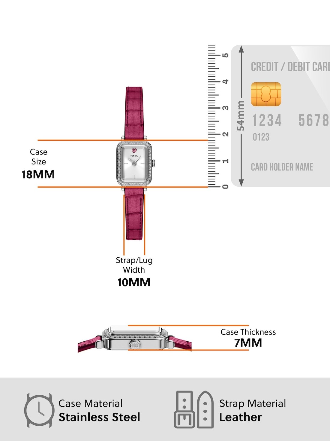 Watch Features fossil, fossil watches for women, women's fossil watches, leather watches for women, pink watches for women, quartz three hand watches for women, raquel, engraving, japan, japanese movement, women's shaped case watches