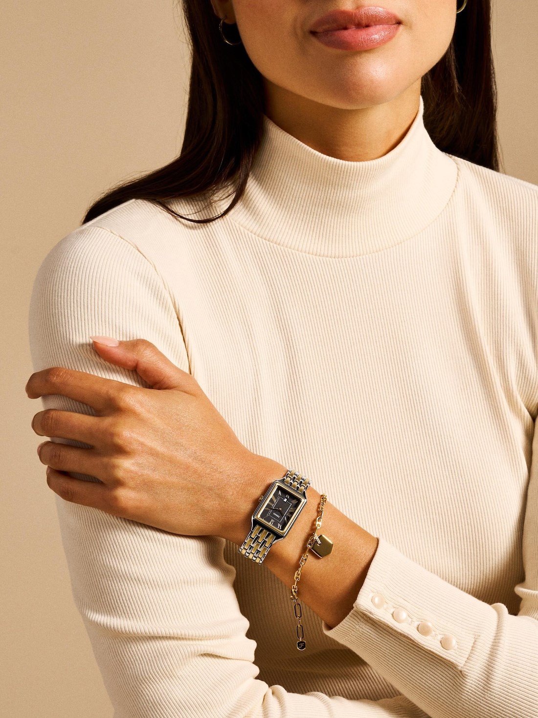 Short Description For an on-trend layered moment, look no further. This watch and bracelet set features a true icon from our archive, the rectangular Raquel watch with a gray dial and two-tone seven-link stainless steel bracelet, paired with a gold-tone stainless steel bracelet featuring our Heritage D-link design.