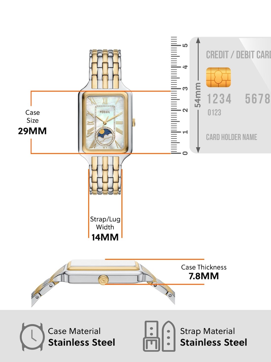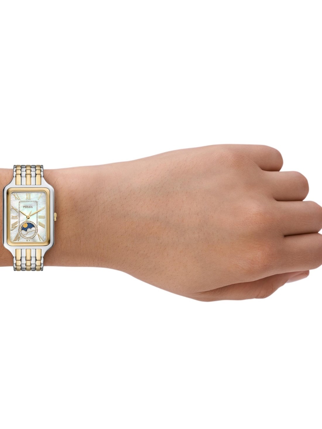 Short Description The Raquel watch is a true icon reborn. Its slim rectangular case and two-tone stainless steel bracelet exude timeless sophistication. A luminous white mother-of-pearl dial keeps things elegant, with a classic Sun Moon multifunction movement offers refined functionality. Vintage-inspired yet refreshingly modern, it's a classic you'll keep in heavy rotation.