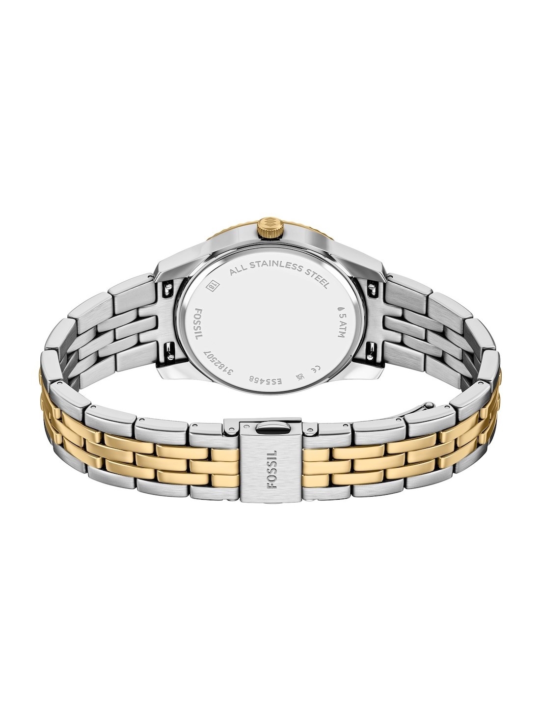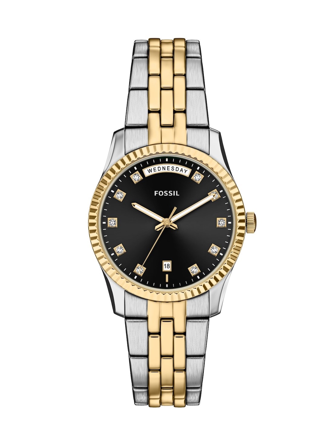 Watch Features fossil, fossil watches for women, women's fossil watches, stainless steel watches for women, multi watches for women, silver and gold two-tone watches for women, quartz three hand day date watches for women, scarlette, engraving, japan, japanese movement, women's classic watches, women's engravable watches