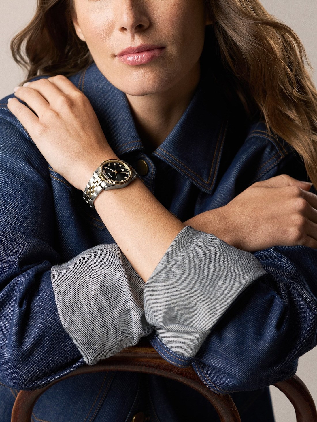 Watch Band: Two-tone gold and silver durable stainless steel bracelet; links can be removed for a customized fit.