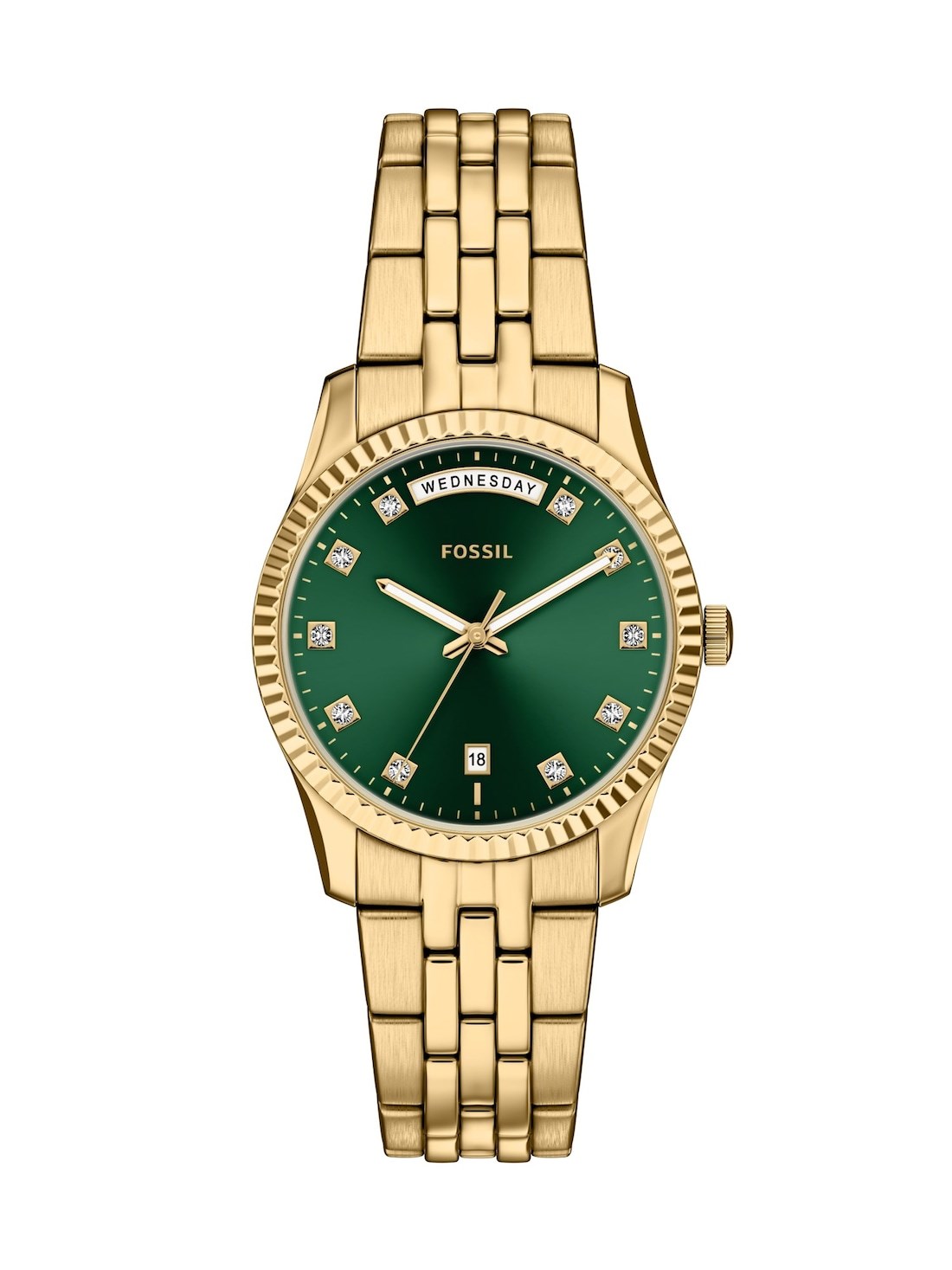 Watch Features fossil, fossil watches for women, women's fossil watches, stainless steel watches for women, gold watches for women, gold-tone watches for women, quartz three hand day date watches for women, scarlette, engraving, japan, japanese movement, women's classic watches, women's engravable watches