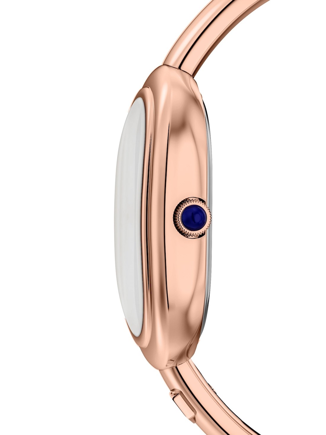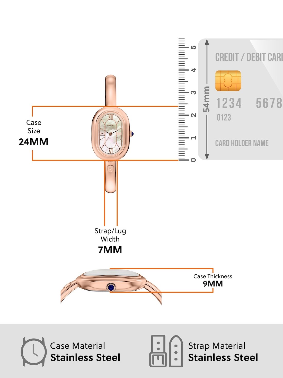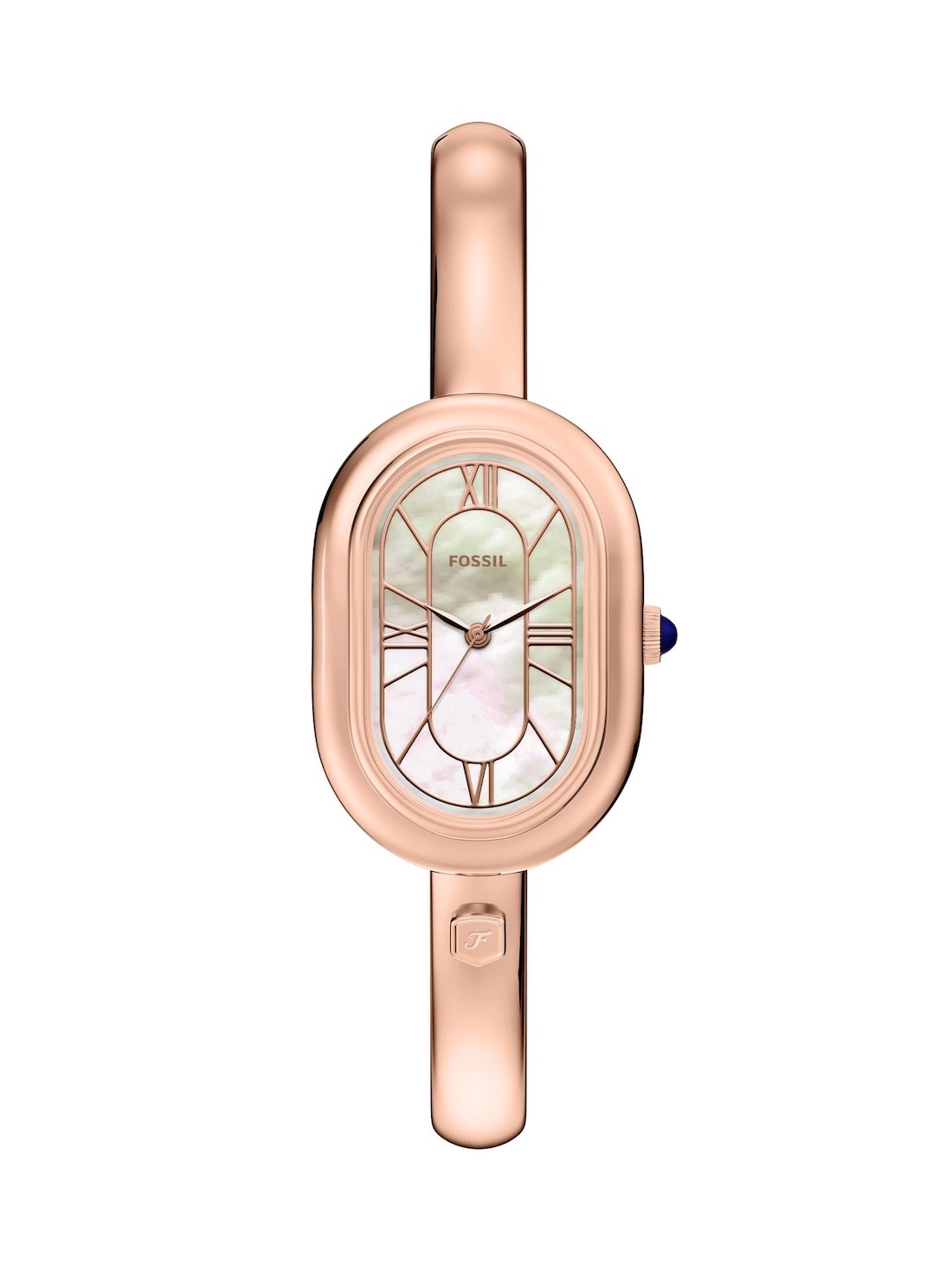 Short Description The rose gold-tone stainless steel jewelry-inspired bangle bracelet pairs seamlessly with the oval case to create a sleek and sophisticated bangle watch. The shiny white mother-of-pearl dial, accented with rose gold-tone hands and indices, enhances the watch's radiant elegance and cohesive design. The bangle bracelet features a convenient push-button closure engraved with the Fossil shield logo, allowing for easy wear and removal.