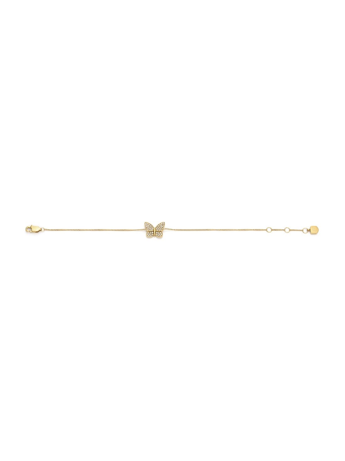 Short Description Symbolizing confidence and transformation, this station bracelet features a gold-tone stainless steel butterfly accented with pavé crystals. The intricate detailing catches the light, adding a subtle shimmer to its design. The lobster clasp closure ensures a secure and adjustable fit, making it easy to wear. Its understated silhouette makes it an effortless addition to any jewelry collection.