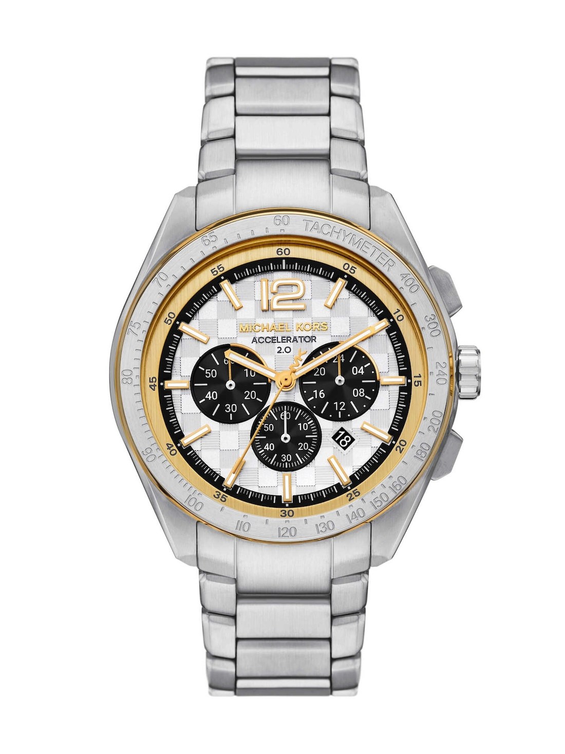 Short Description Michael Kors' 44mm Accelerator 2.0 watch features a silver brushed textured dial, chronograph movement and stainless steel bracelet.