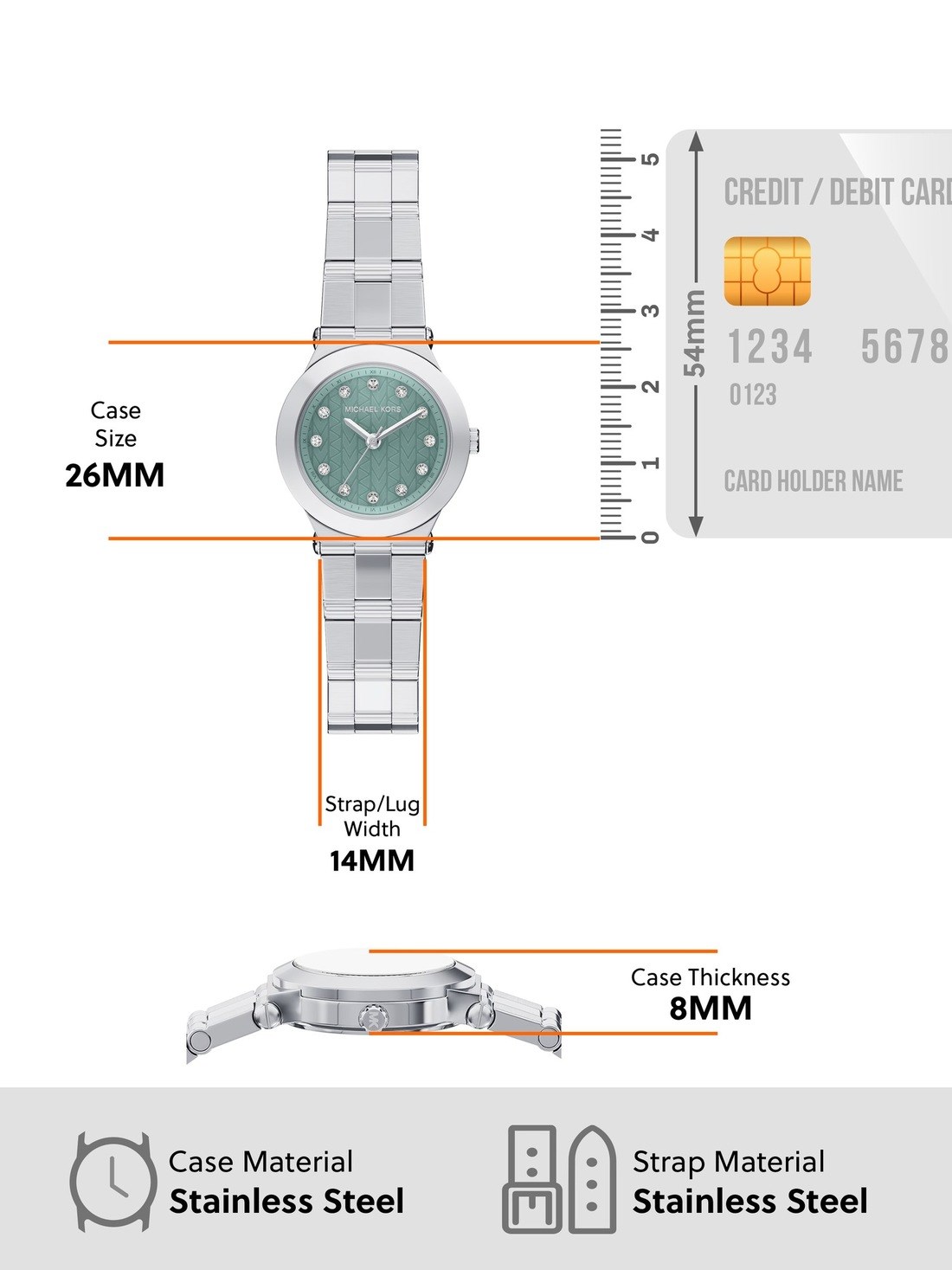 Watch Band: Silver durable stainless steel bracelet; links can be removed for a customized fit.