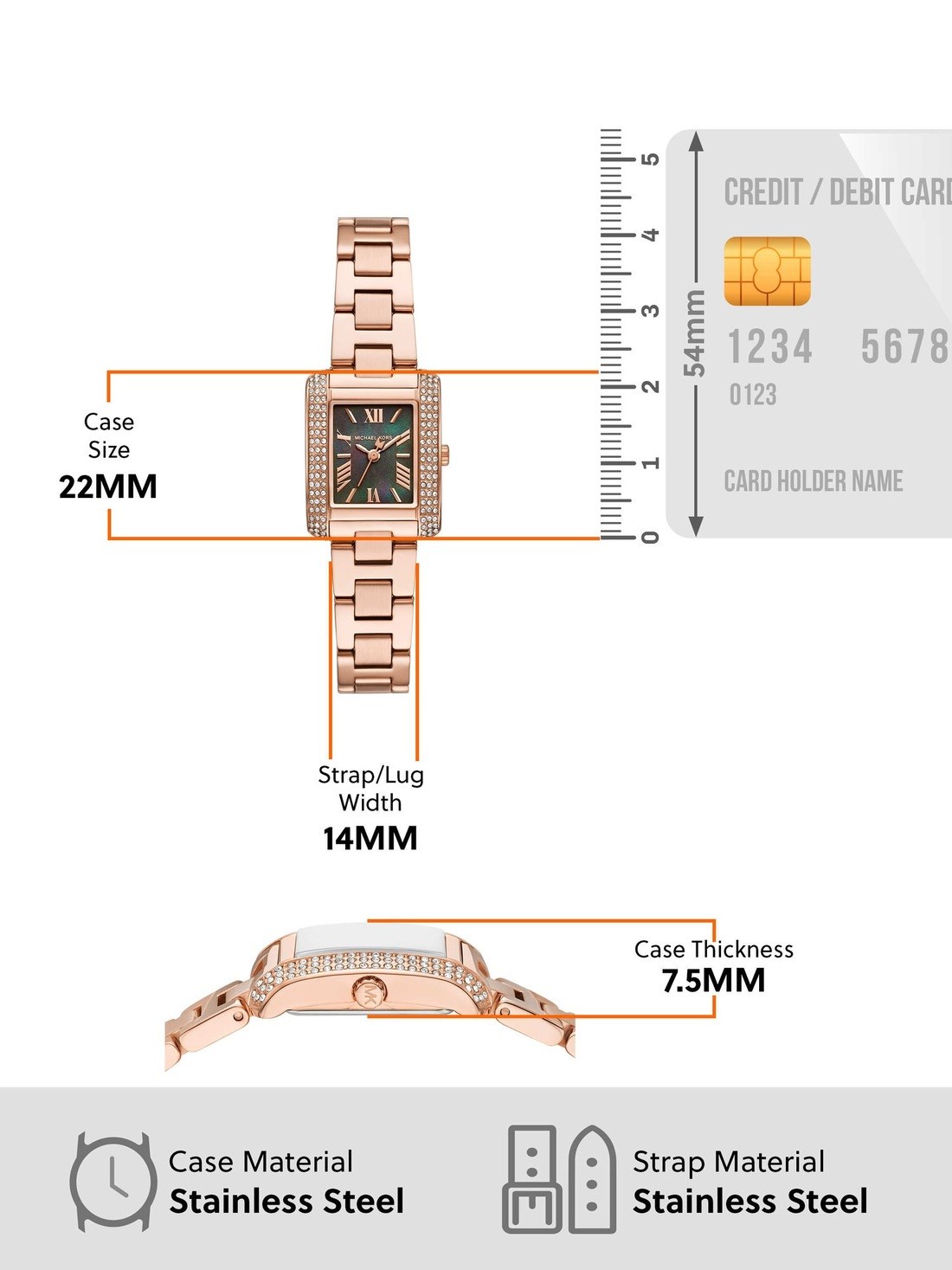 Watch Features mk, michael kors, michael kors watches for women, women's michael kors watches, stainless steel watches for women, rose gold watches for women, quartz three hand watches for women, japan, japanese movement, emery, mother of pearl dial