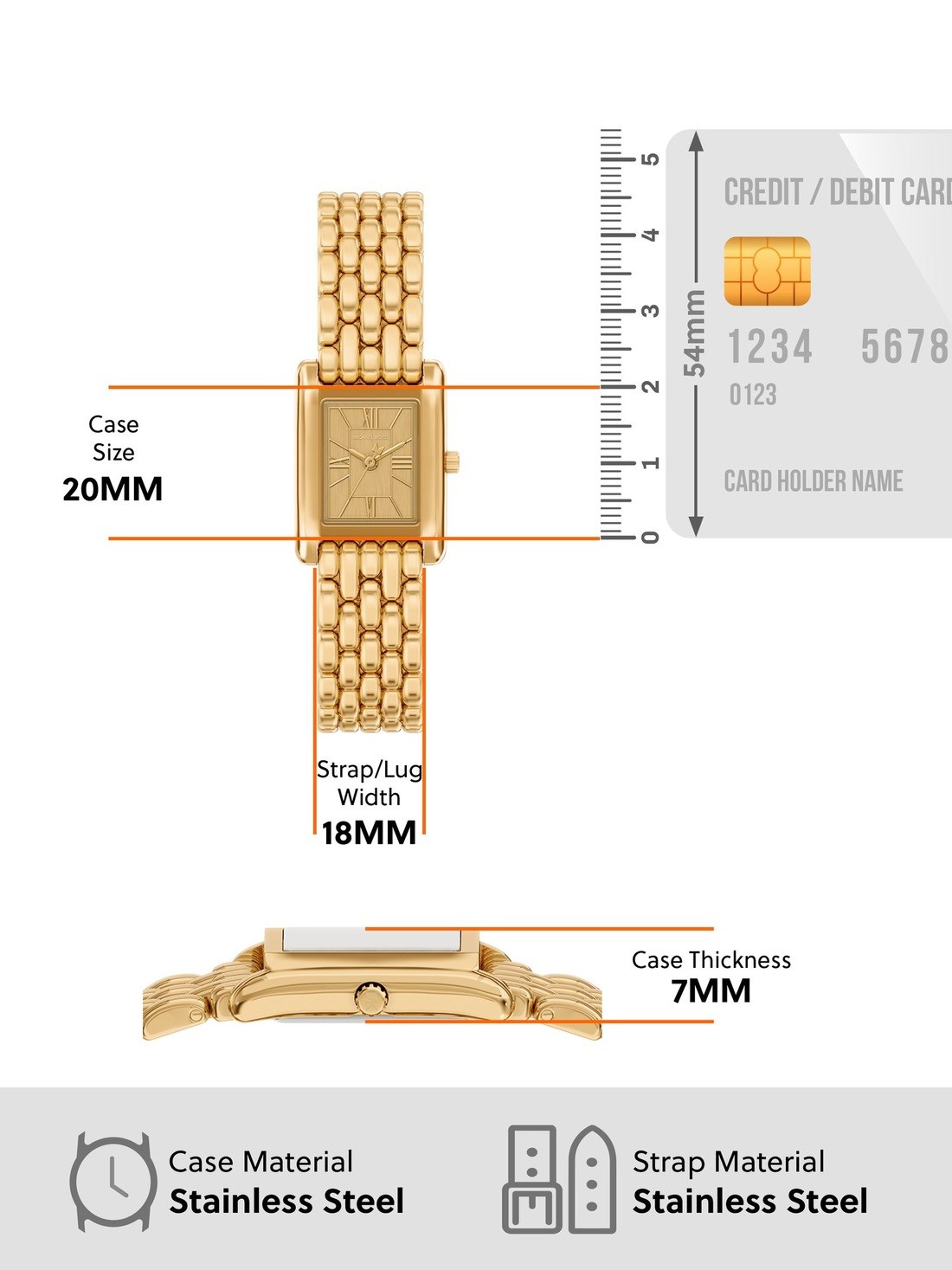 Watch Band: Gold durable stainless steel bracelet; links can be removed for a customized fit.