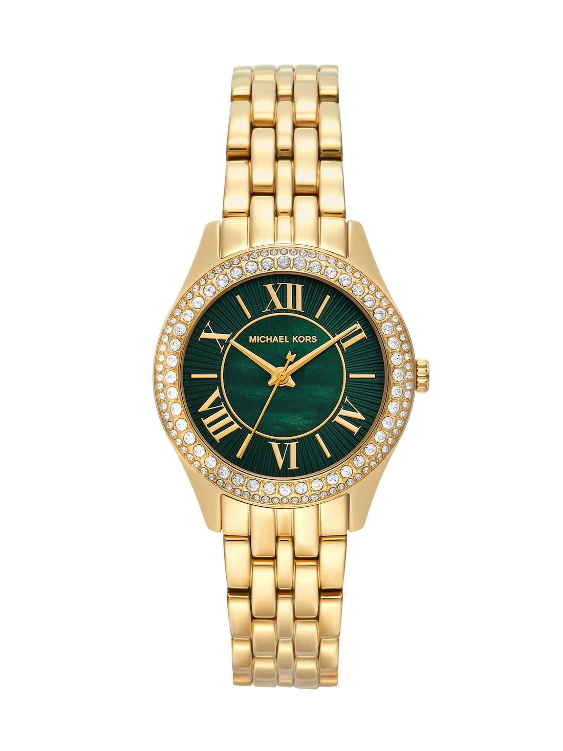 Short Description Michael Kors' 33mm Harlowe watch features a green mother-of-pearl glossy dial, three-hand movement and gold-tone stainless steel bracelet.