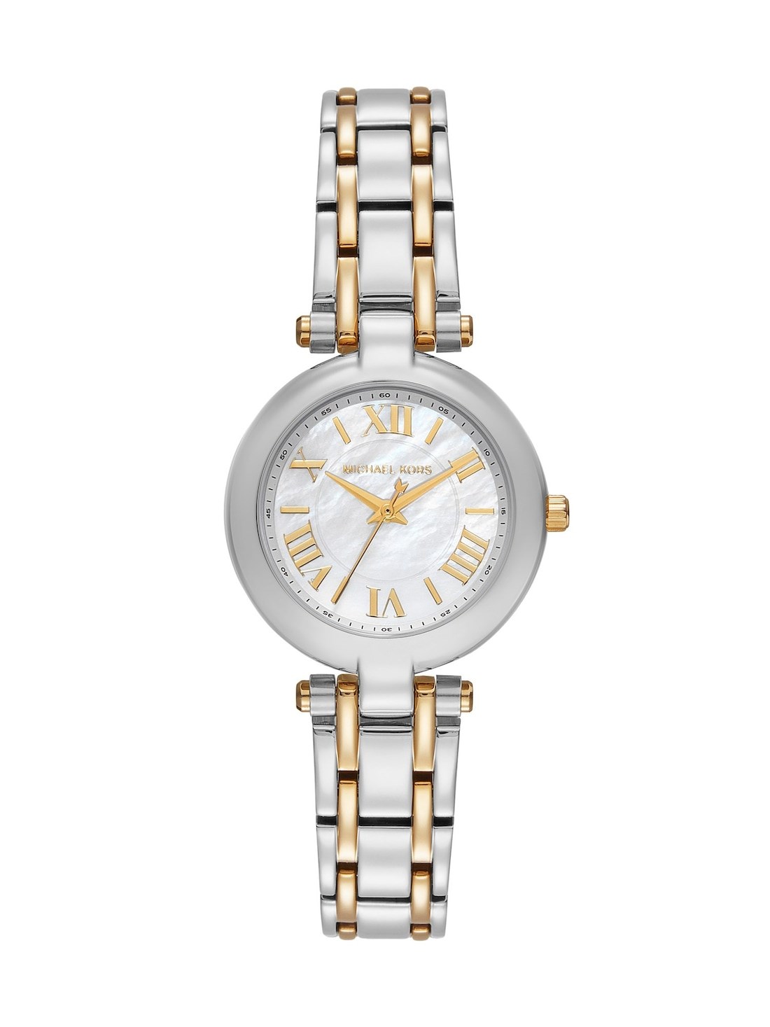 Short Description Michael Kors' Laney 30mm watch features a glossy white dial, three-hand quartz movement, and a chic two-tone stainless steel bracelet in silver and gold.