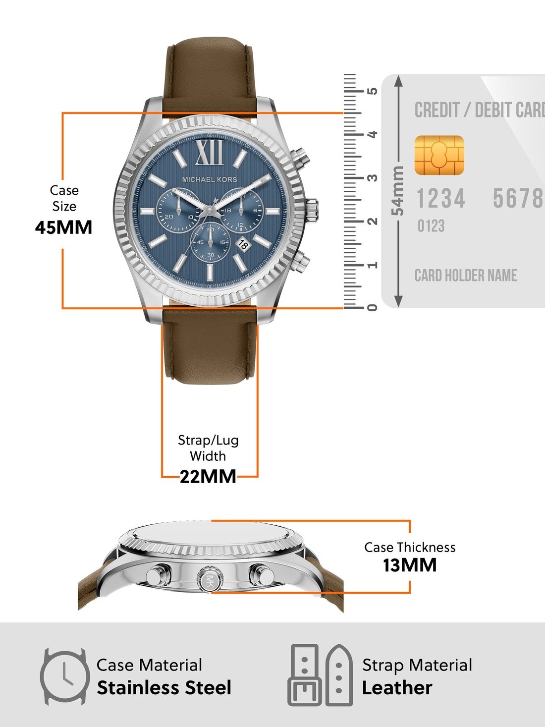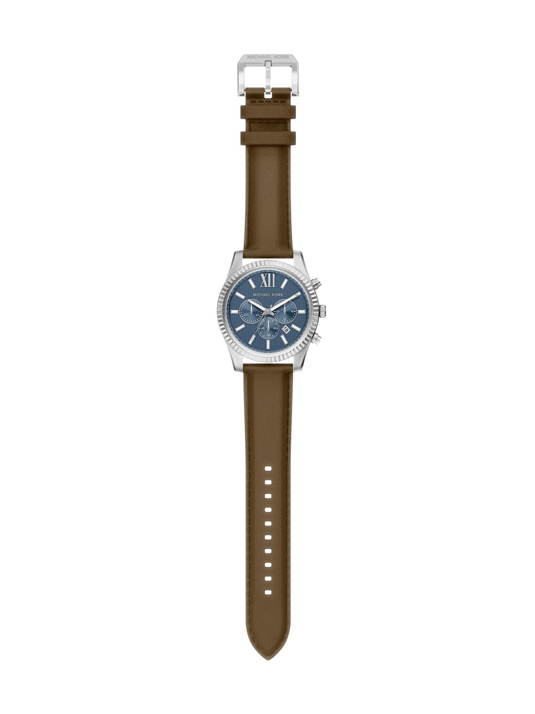 Watch Features mk, michael kors, michael kors watches for men, men's michael kors watches, leather watches for men, brown watches for men, lexington, quartz chronograph, japan, japanese movement, blue, blue watch, blue dial