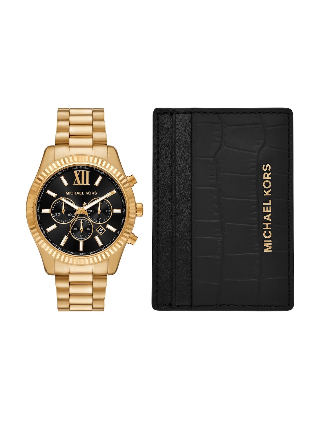 Short Description Designed with the aspirational man in mind, the Lexington gift set features a classic gold-tone watch with a sleek black dial and beveled stainless steel bezel and bracelet that offer tactile texture. Paired with a stylish card case, this set combines timeless style with exceptional gifting value.