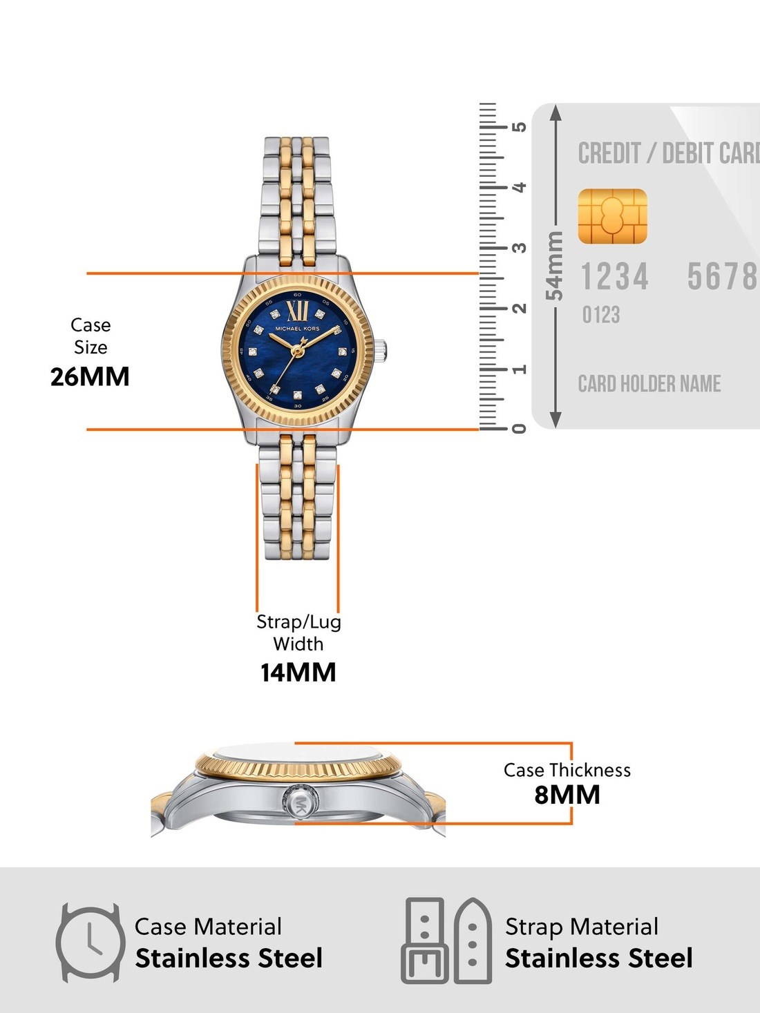 Short Description Michael Kors' 26mm Lexington watch features a navy mother-of-pearl glossy dial, three-hand movement and two-tone stainless steel bracelet.