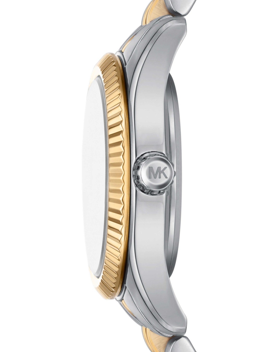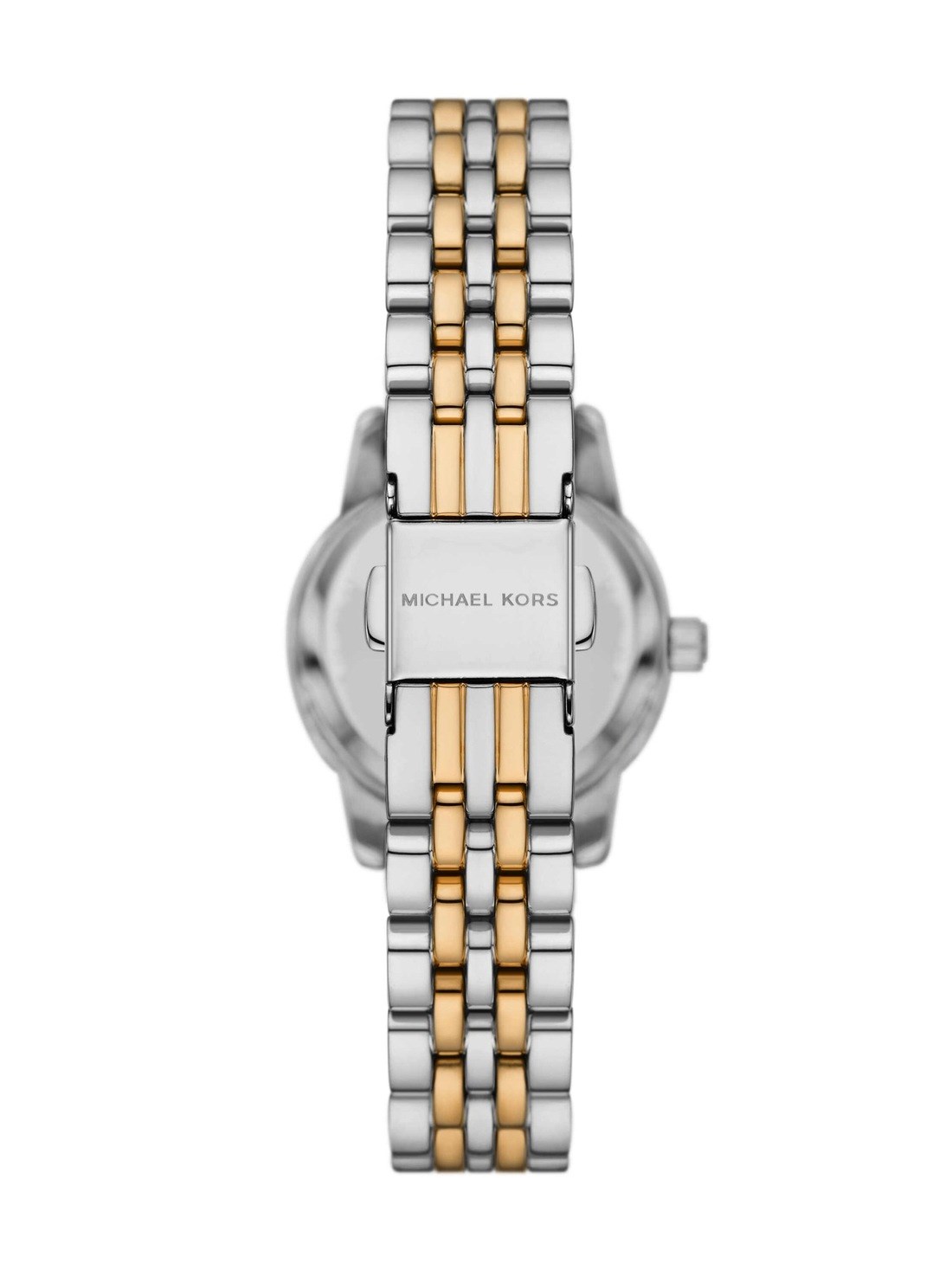 Watch Features mk, michael kors, michael kors watches for women, women's michael kors watches, stainless steel watches for women, two-tone watches for women, silver and gold watches for women, quartz three hand watches for women, japan, japanese movement, lexington, mother of pearl dial