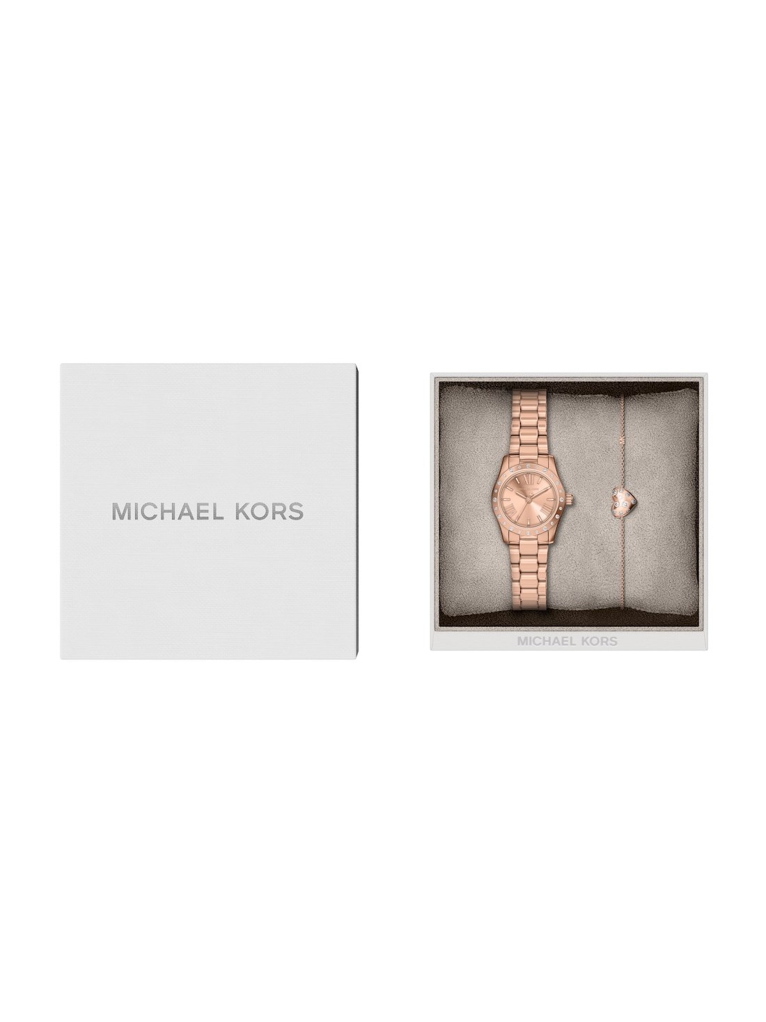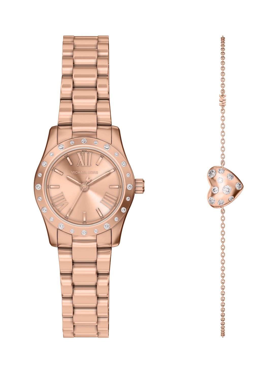 Short Description A polished essential for every day, this Michael Kors timepiece pairs a rose gold-tone stainless steel bracelet with a coordinating sunray dial. Paired with a scattered pavé heart bracelet to match the bezel, it’s a chic and thoughtful gifting choice.