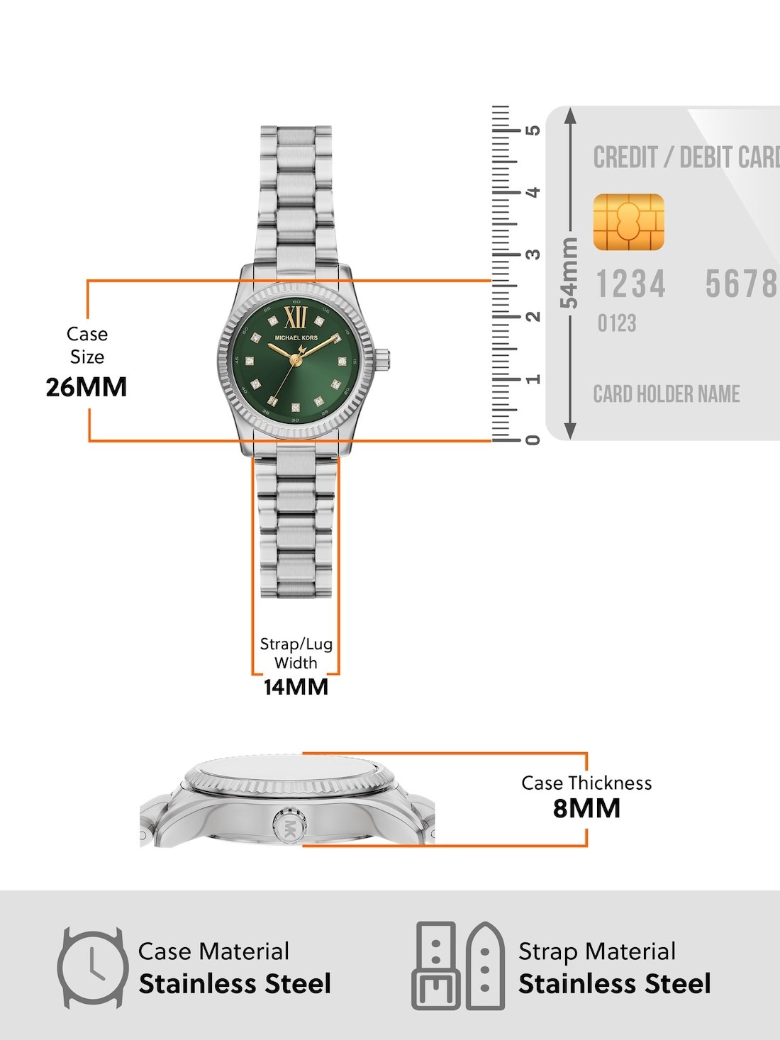 Watch Features mk, michael kors, michael kors watches for women, women's michael kors watches, stainless steel watches for women, silver-tone watches for women, silver watches for women, lexington, quartz three hand, japan, japanese movement, green, green dial, green watch