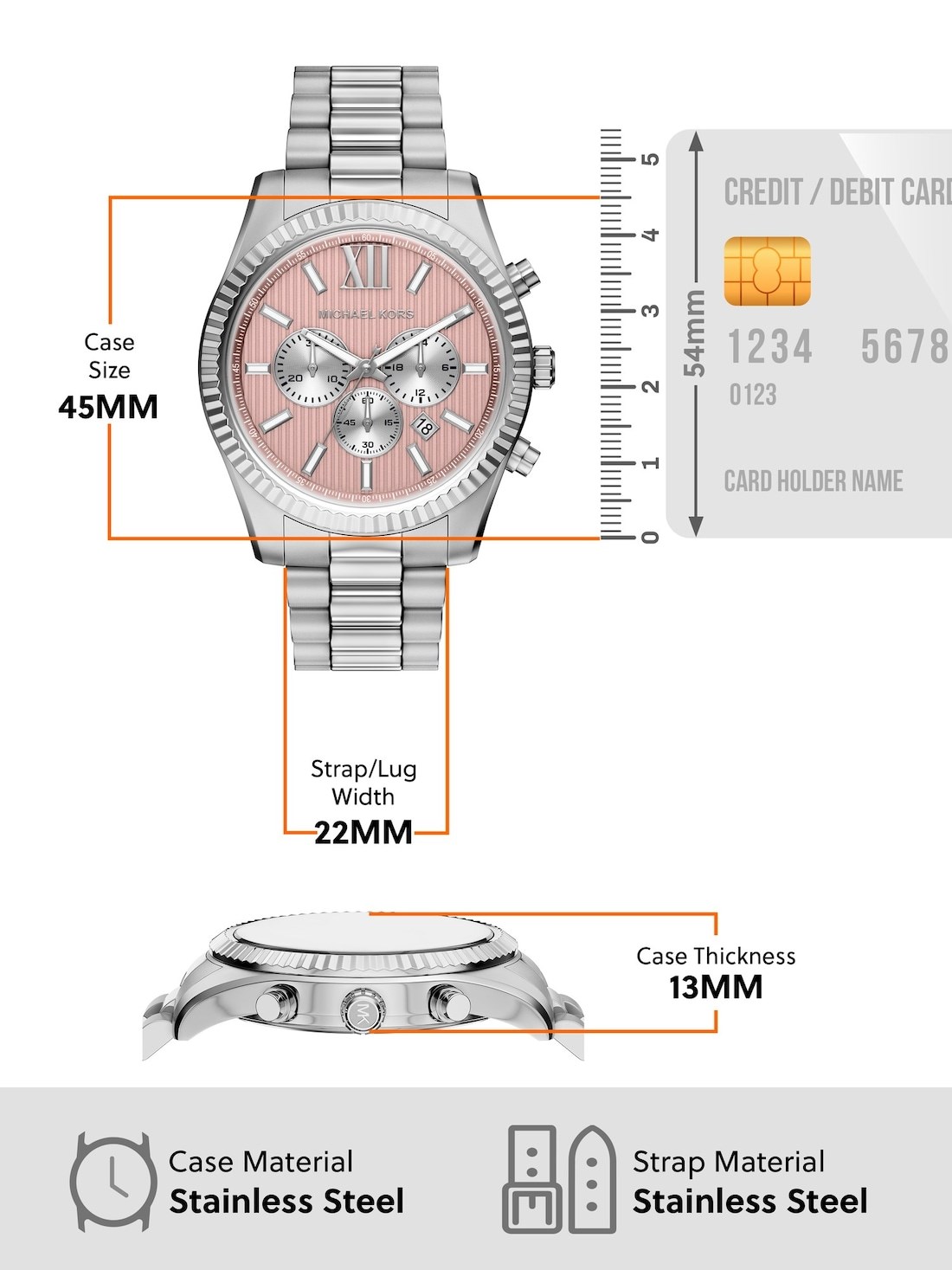 Watch Features mk, michael kors, michael kors watches for men, men's michael kors watches, stainless steel watches for men, silver-tone watches for men, silver watches for men, lexington, quartz chronograph, japan, japanese movement, pink, pink dial, pink watch