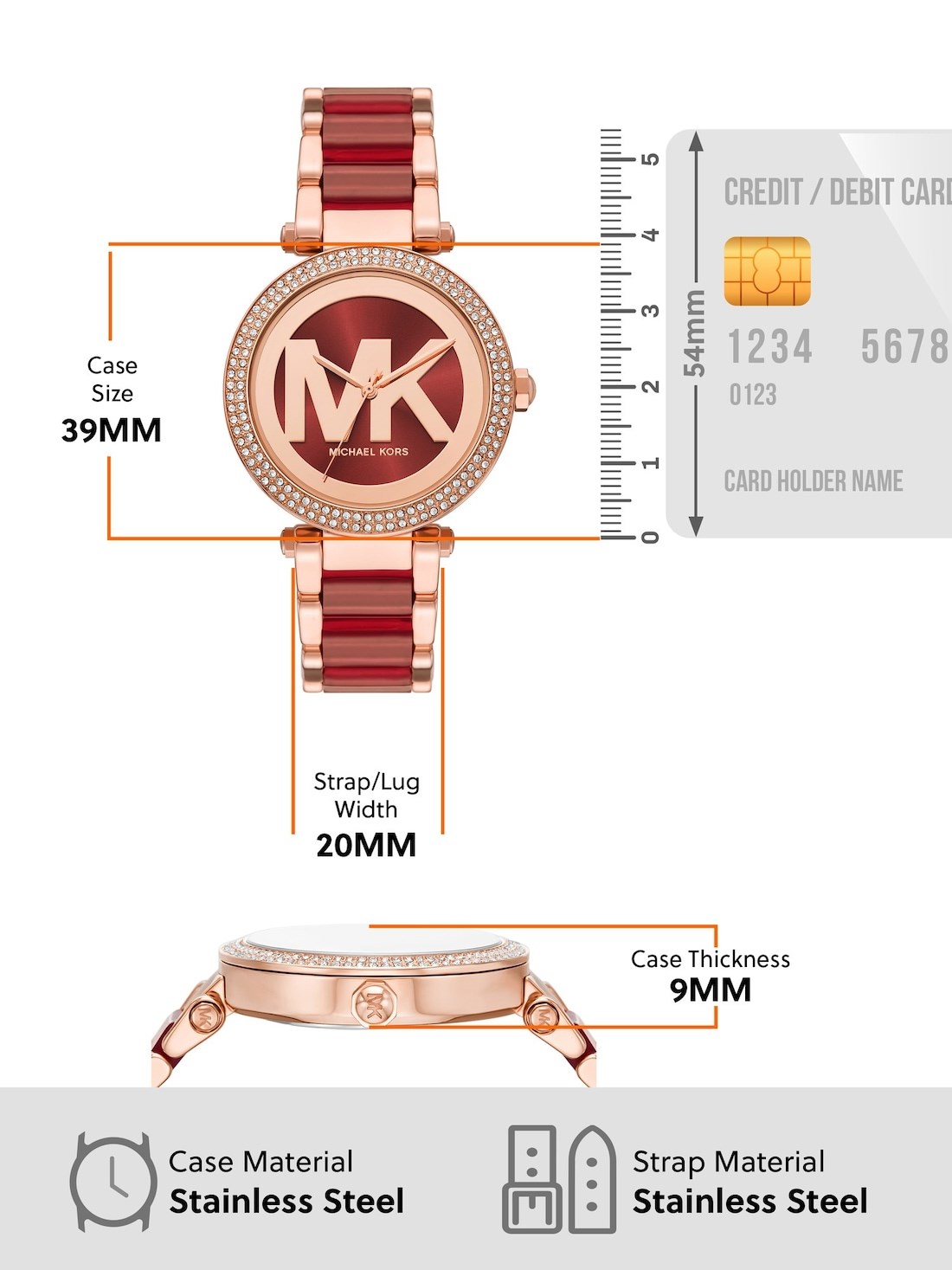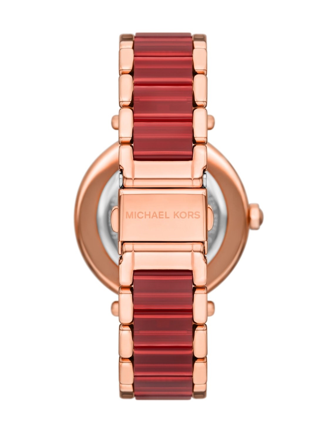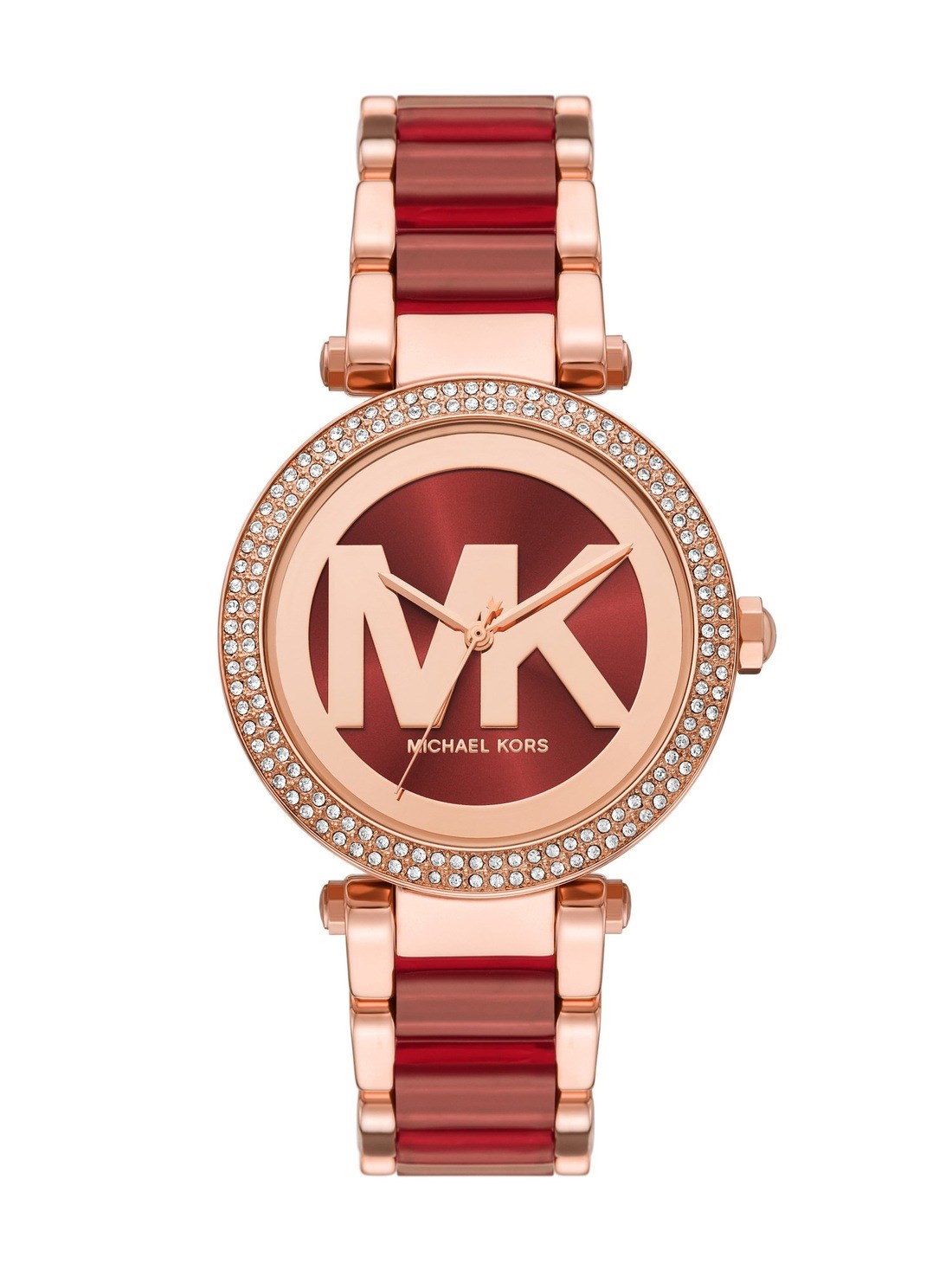 Short Description Turn your attention to the Parker: this sleek-and-chic timepiece is trimmed with sparkling pavé stones for an elegant, uptown sensibility. We updated this favorite by adding our Signature logo onto the rose gold-tone dial and finishing it with a red acetate strap. With just the right amount of sparkle, it's the perfect watch to glam up an everyday look.