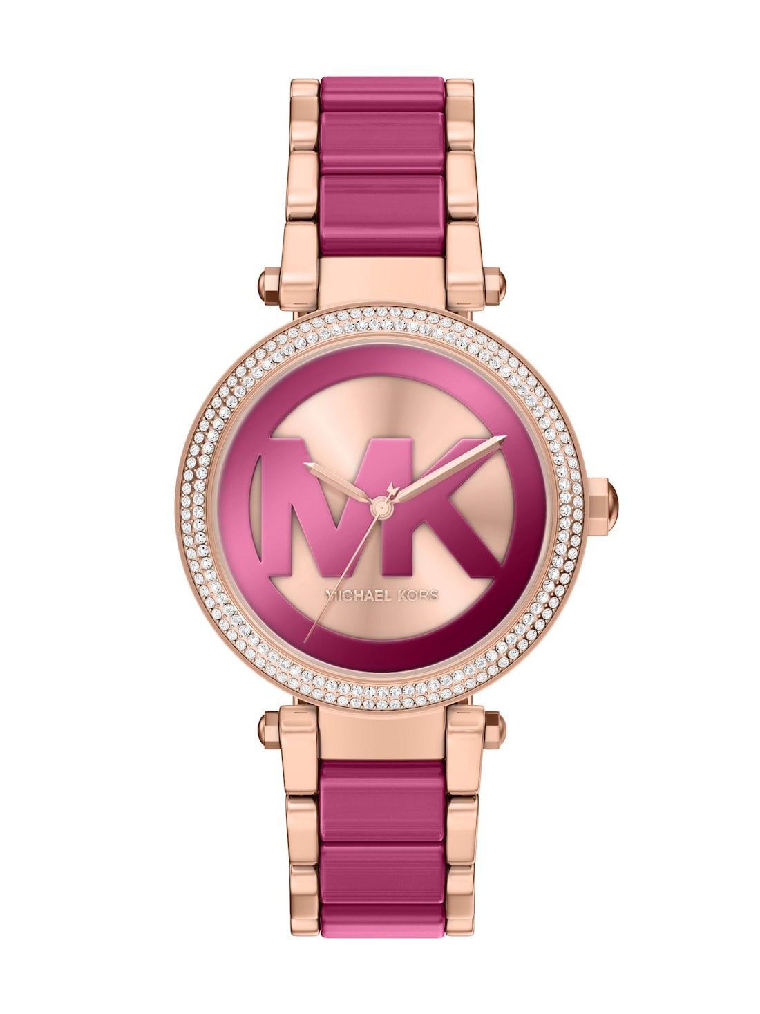 Short Description Turn your attention to the Parker: this sleek-and-chic timepiece is trimmed with sparkling pavé stones for an elegant, uptown sensibility. We updated this favorite by adding our Signature logo onto the rose gold-tone dial and finishing it with a pink acetate strap. With just the right amount of sparkle, it's the perfect watch to glam up an everyday look.