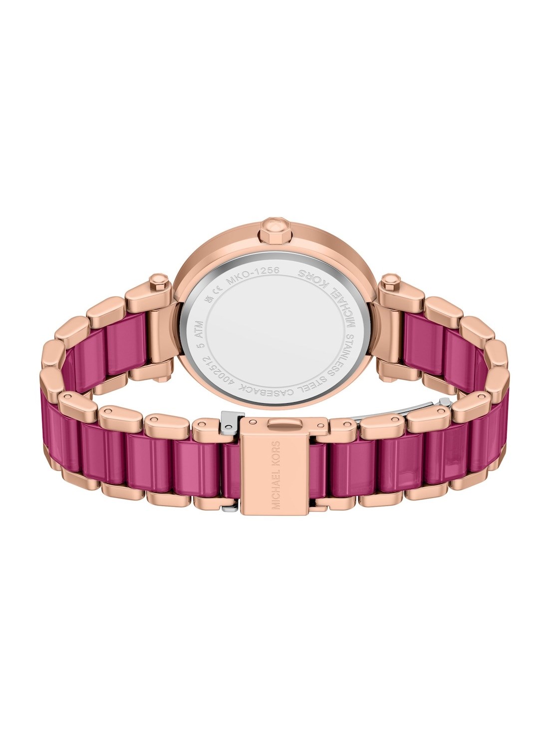 Watch Features mk, michael kors, michael kors watches for women, women's michael kors watches, stainless steel watches for women, multi watches for women, pink watches for women, rose gold watches for women, parker, quartz three hand, japan, japanese movement, pink, pink watch, pink strap