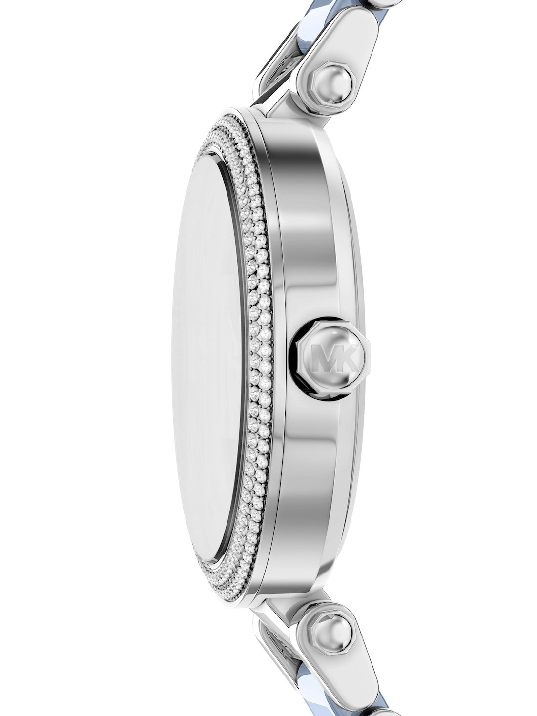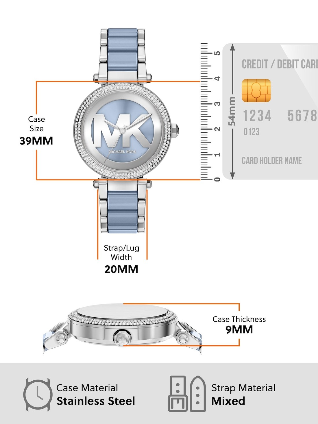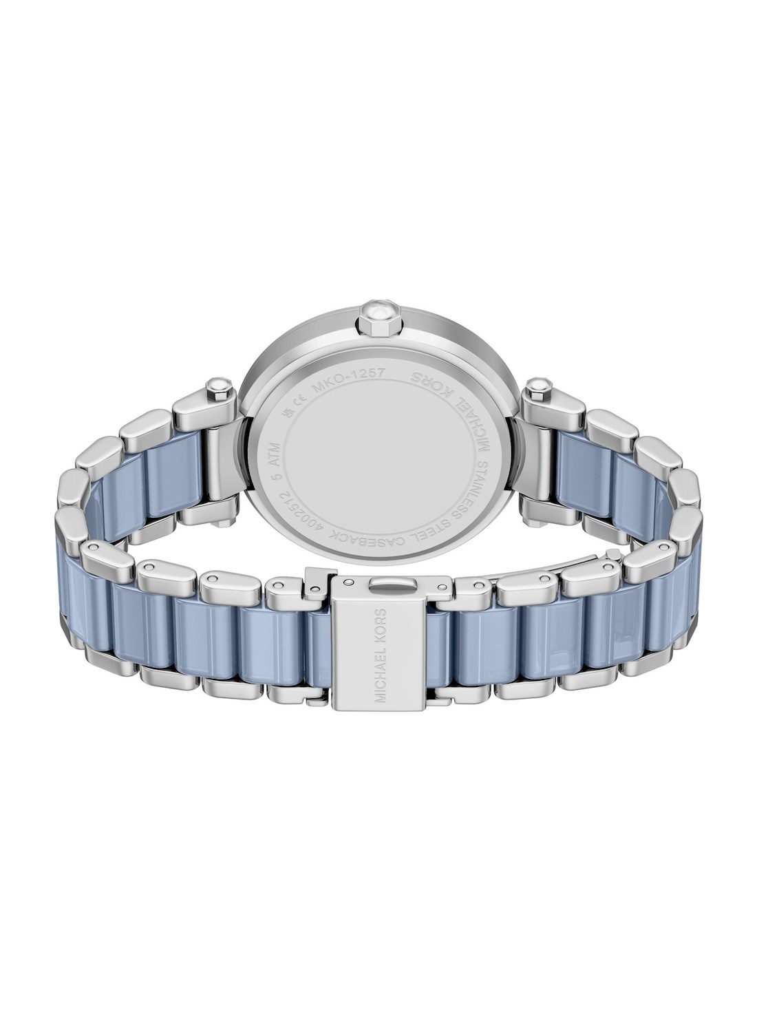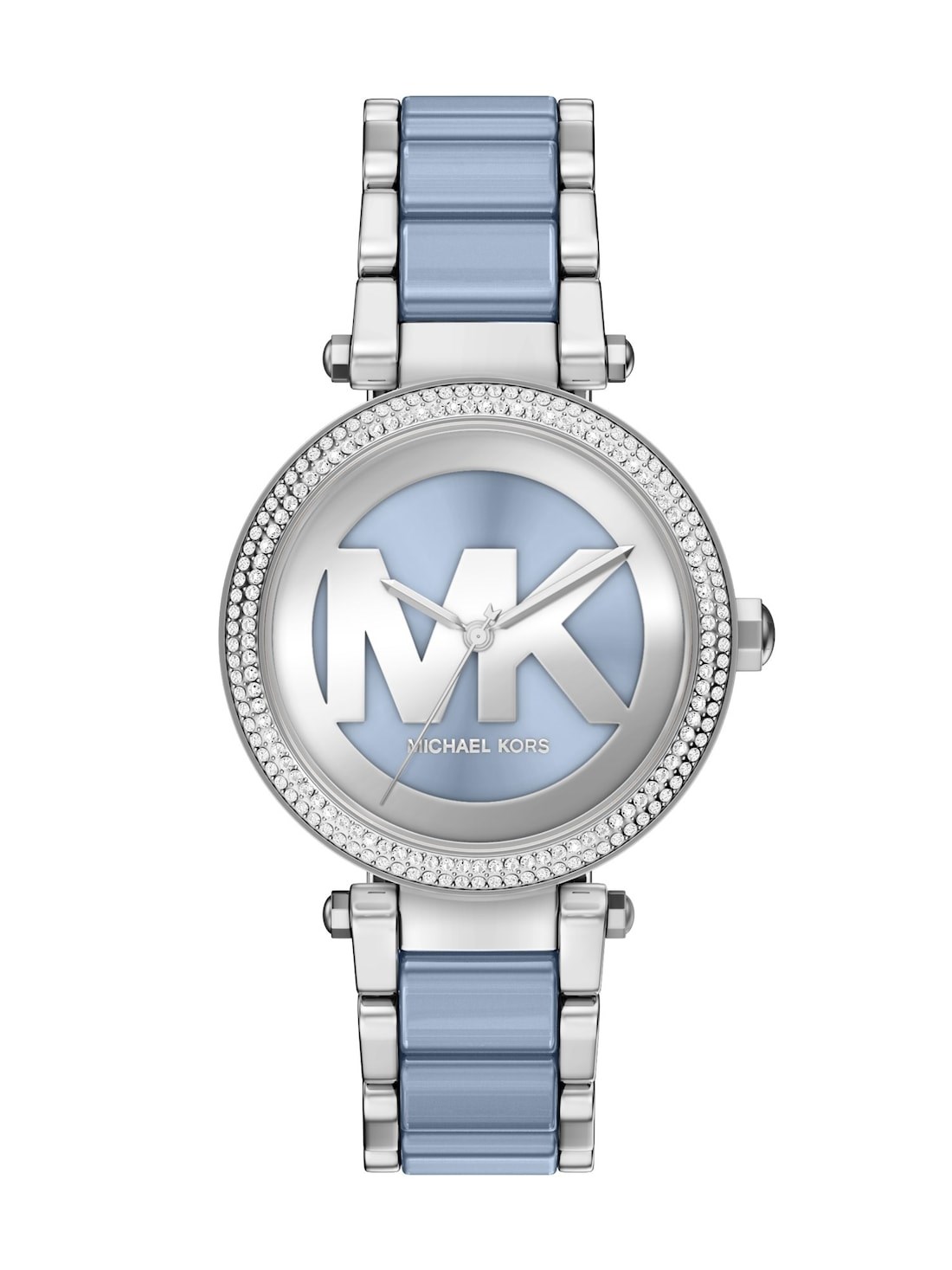 Watch Features mk, michael kors, michael kors watches for women, women's michael kors watches, stainless steel watches for women, multi watches for women, blue watches for women, silver watches for women, parker, quartz three hand, japan, japanese movement, blue, blue watch, blue strap, blue dial