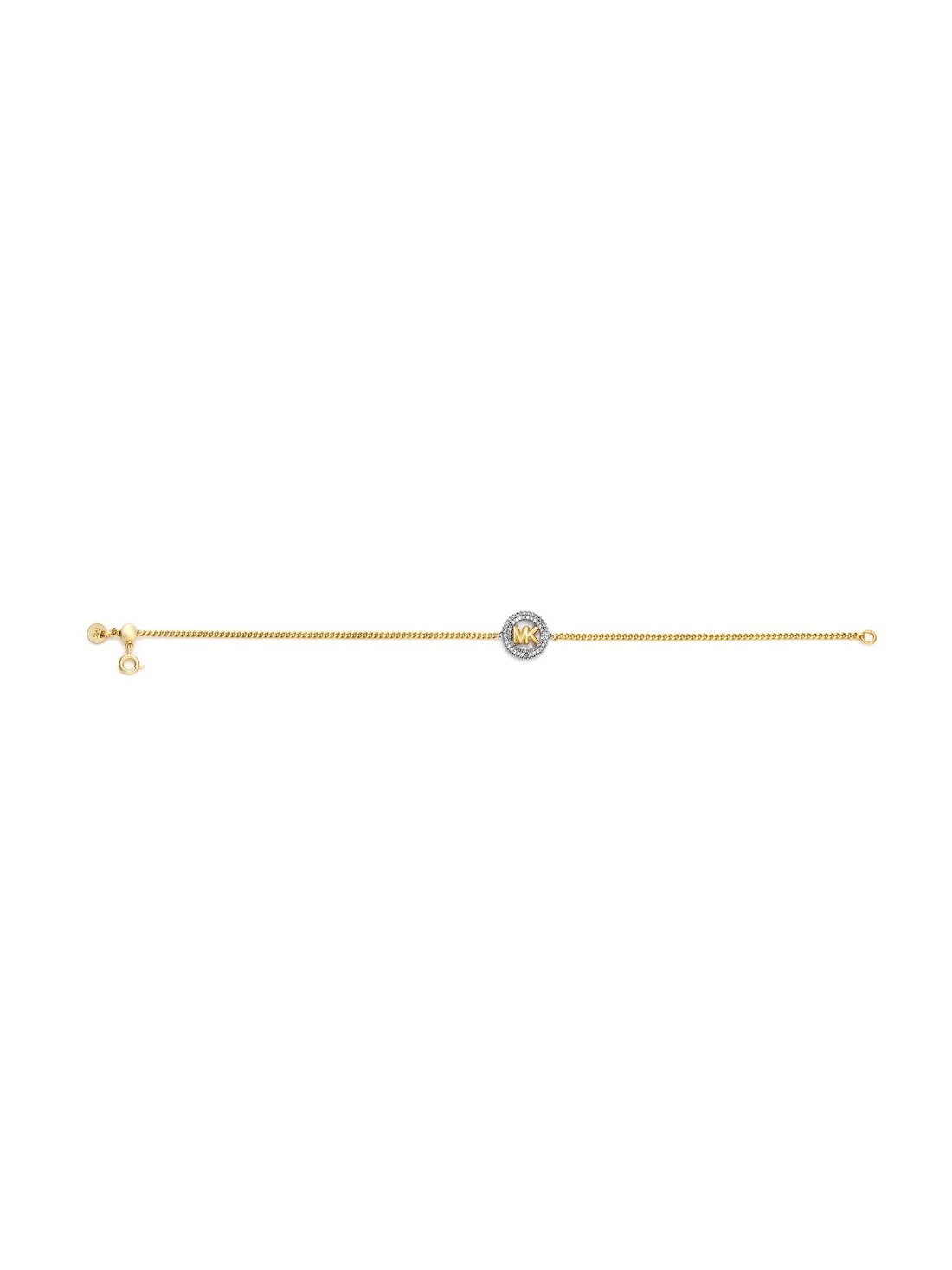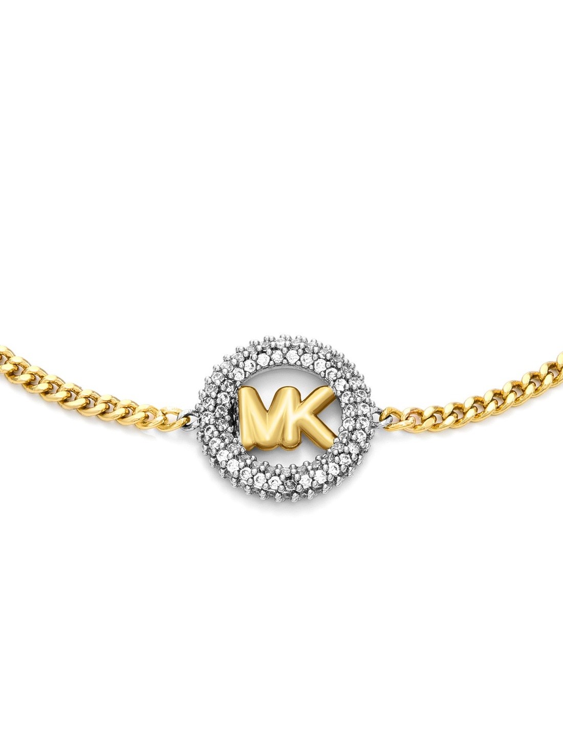 Short Description The Kors MK collection of jewelry celebrates Michael's life and work, with the signature MK logo featured as a core design element. This bracelet showcases a polished gold-tone logo with sparkling pavé adorned a micro curb link chain. The spring ring closure and adjustable slider makes it secure and customizable.