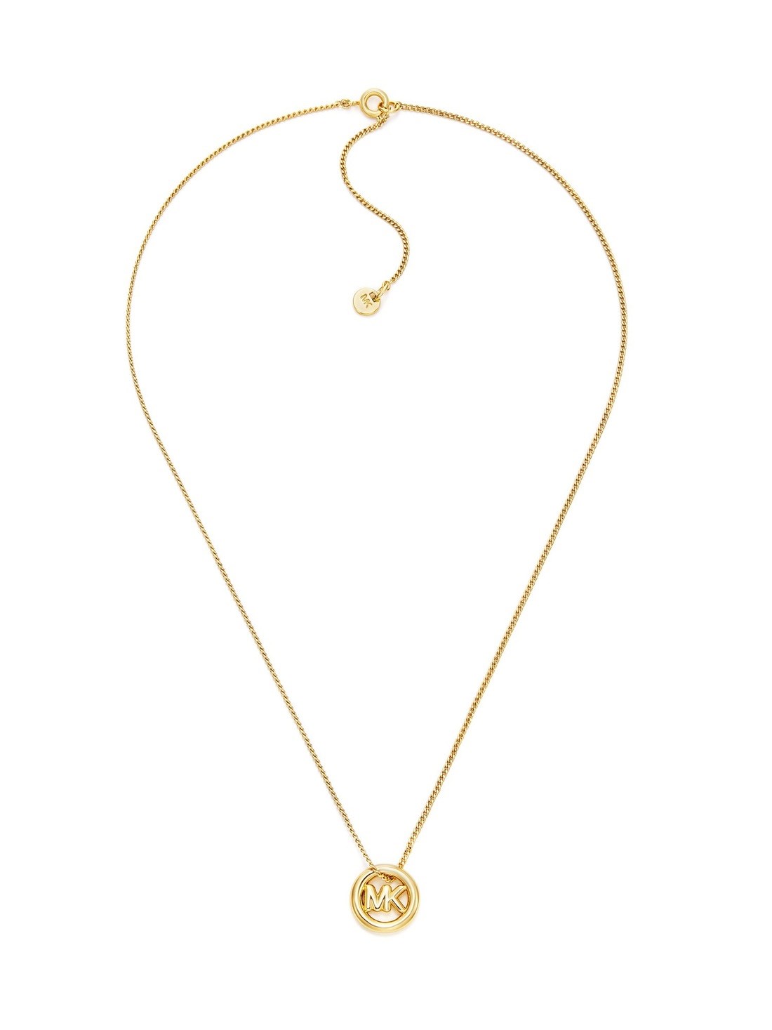 Short Description The Kors MK collection of jewelry celebrates Michael's life and work, with the signature MK logo featured as a core design element. This pendant necklace showcases a polished gold-tone logo pendant. The scale and secure spring ring closure makes it perfect for everyday wear.