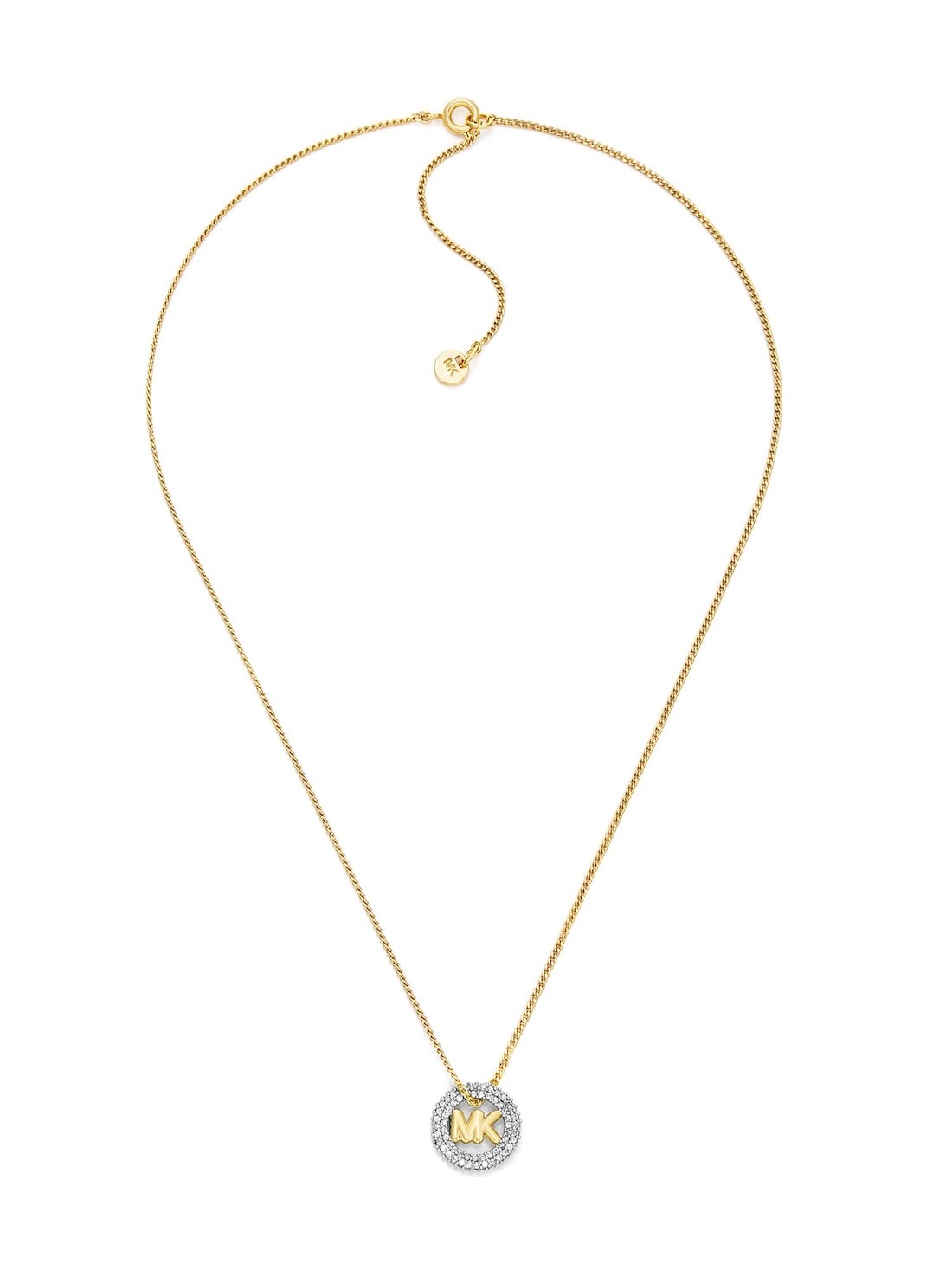 Short Description The Kors MK collection of jewelry celebrates Michael's life and work, with the signature MK logo featured as a core design element. This pendant necklace showcases a gold-tone chain and logo adorned with sparkling pavé accents.The scale and secure spring ring closure makes it perfect for everyday wear.