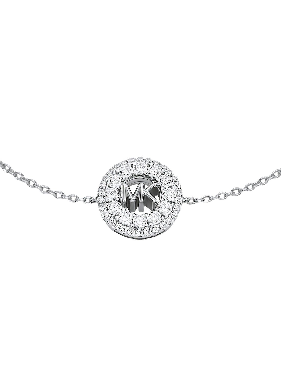 Short Description The Kors MK collection of jewelry celebrates Michael's life and work, with the signature MK logo featured as a core design element. Crafted from sterling silver and plated in rhodium, this adjustable bracelet combines the classic logo with radiant shimmer. Pair it with the matching necklace for a cohesive ensemble.