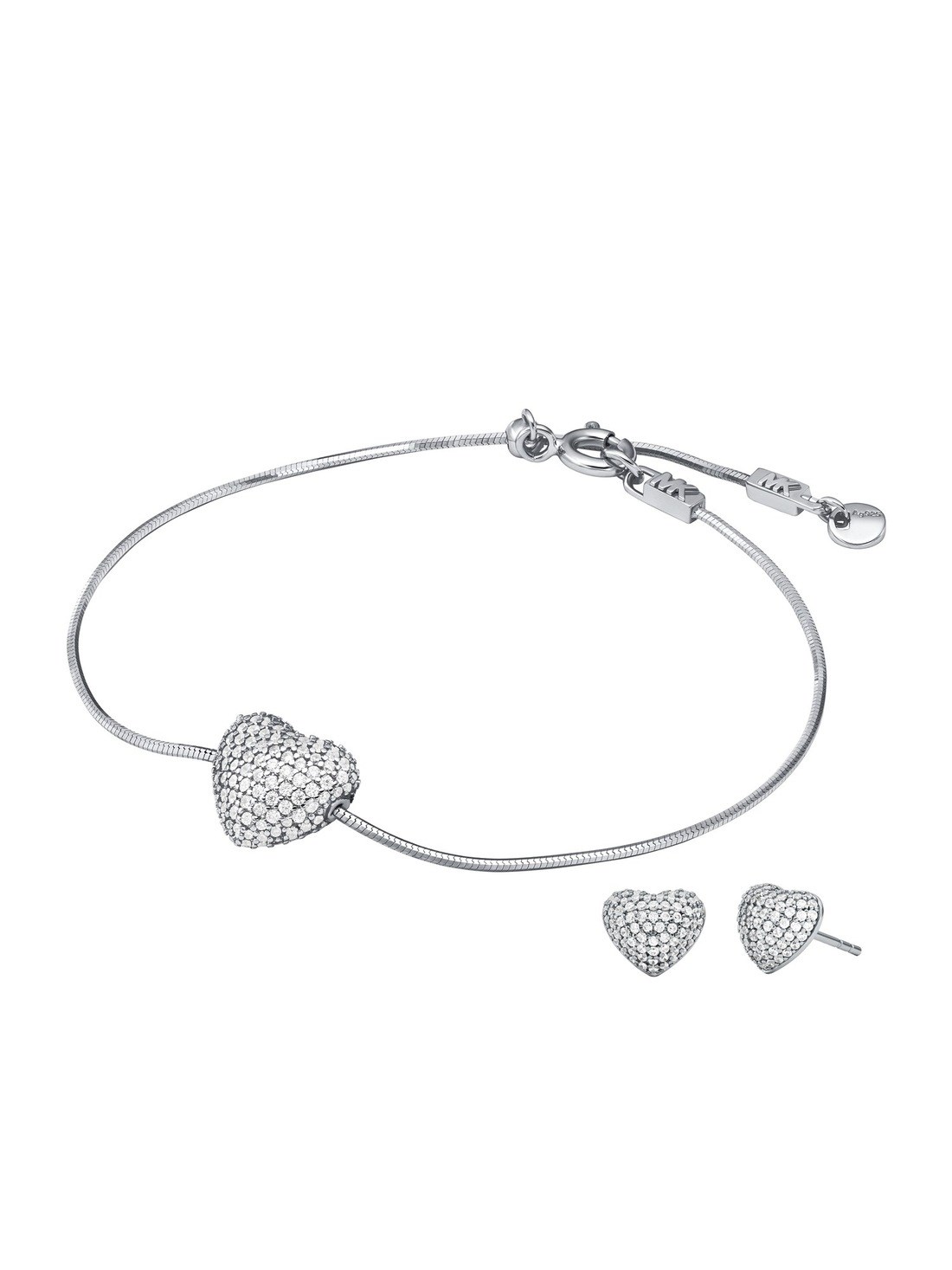 Short Description The Kors Love collection, where modern designs intertwine with messages of love. Crafted with care, this charming rhodium plated sterling silver bracelet and stud earring set, is a symbol of affection. These styles boast a heart charm adorned with sparkling cubic zirconia pavé for an extra touch of allure. The bracelet is secured with a spring ring and slider closure, ensuring a perfect fit. This matching set presents a coordinated ensemble that exudes timeless romance and elegance.