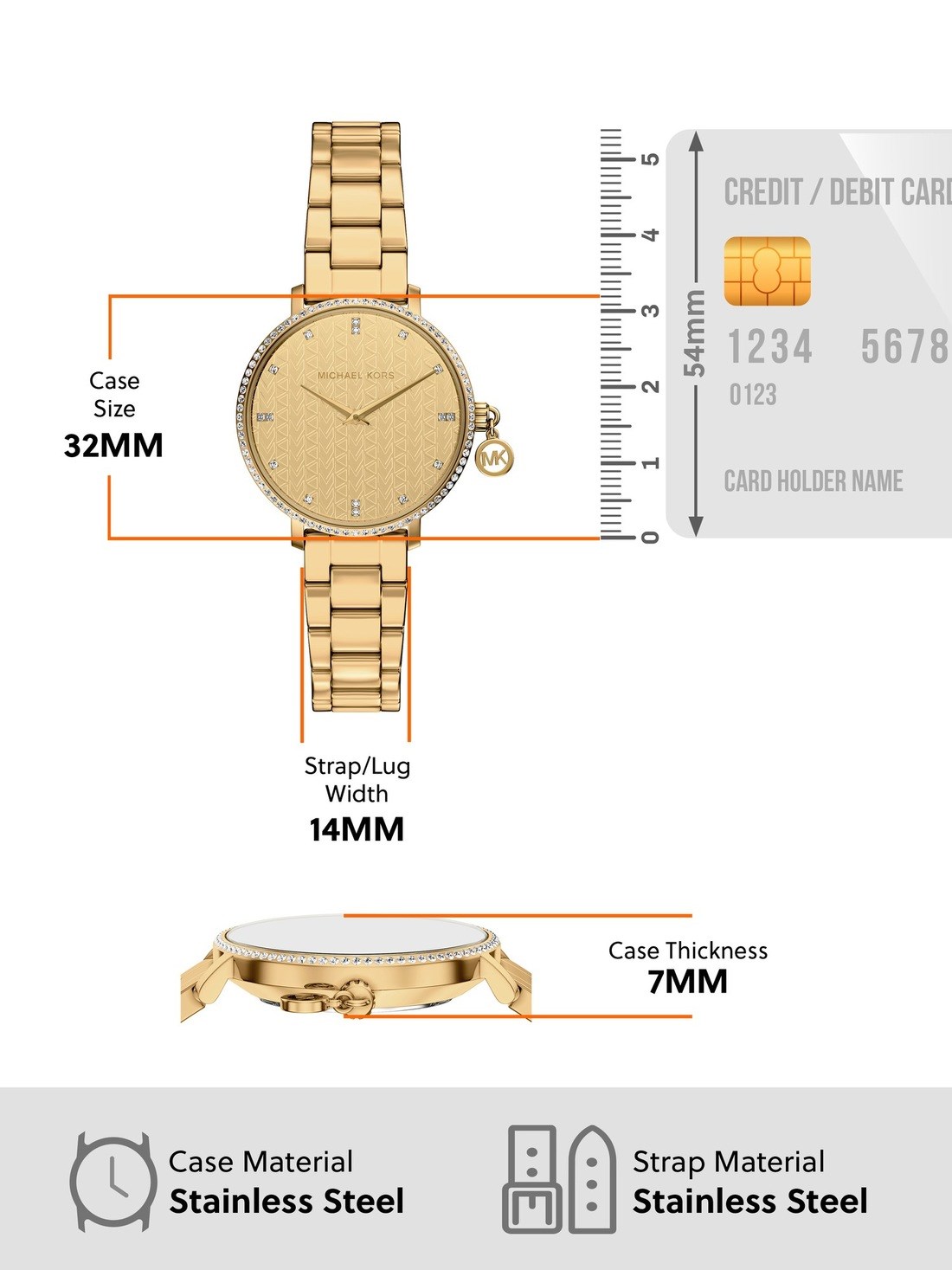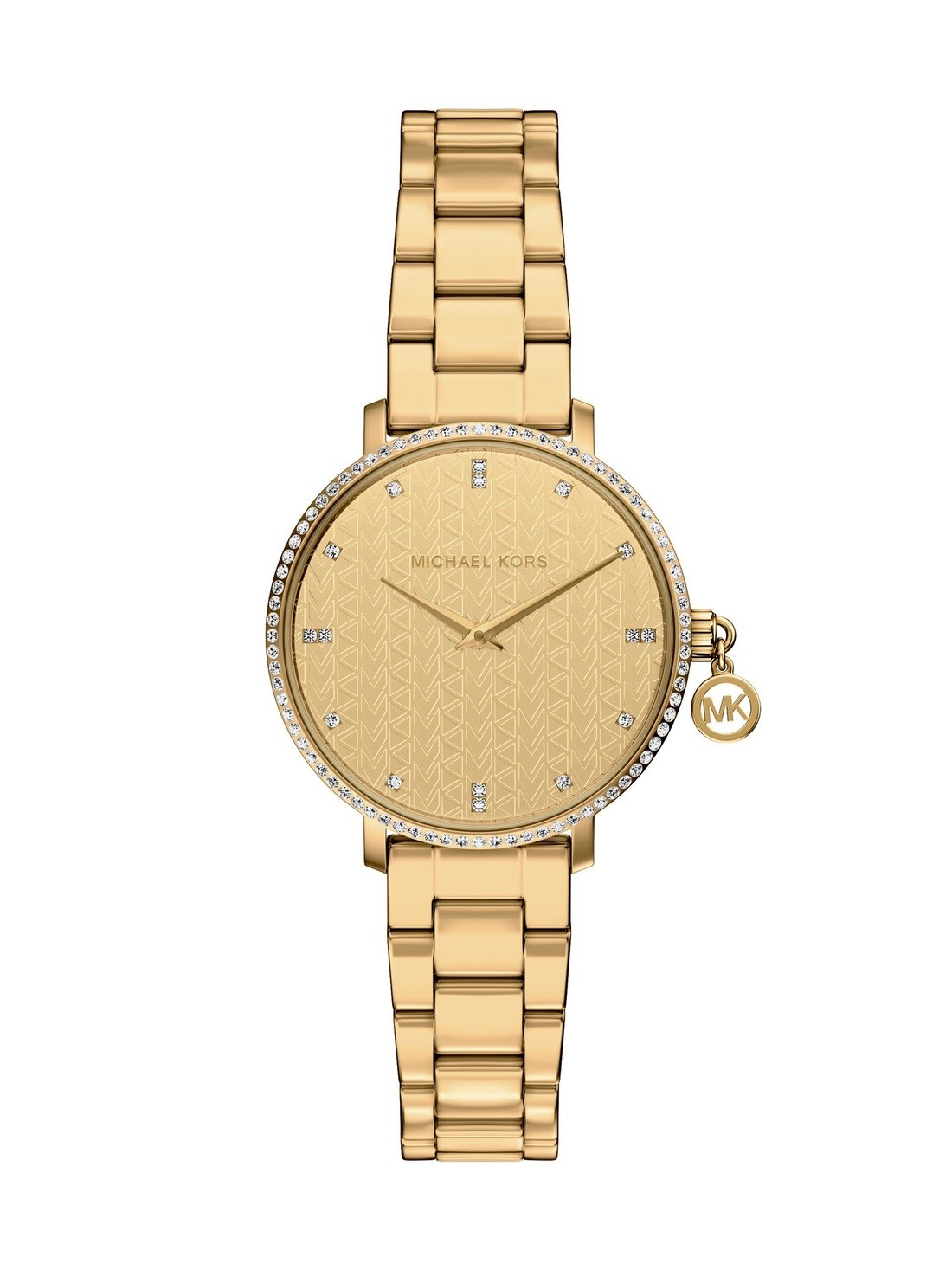 Watch Features mk, michael kors, michael kors watches for women, women's michael kors watches, stainless steel watches for women, gold-tone watches for women, gold watches for women, pyper, quartz two hand, japan, japanese movement