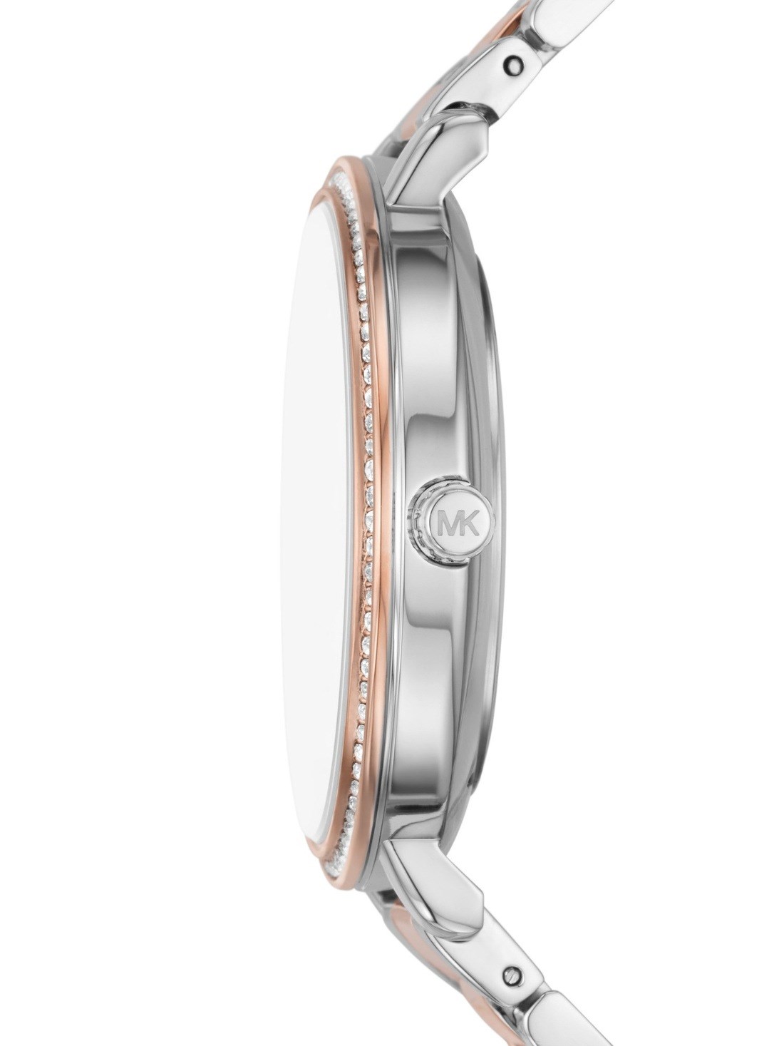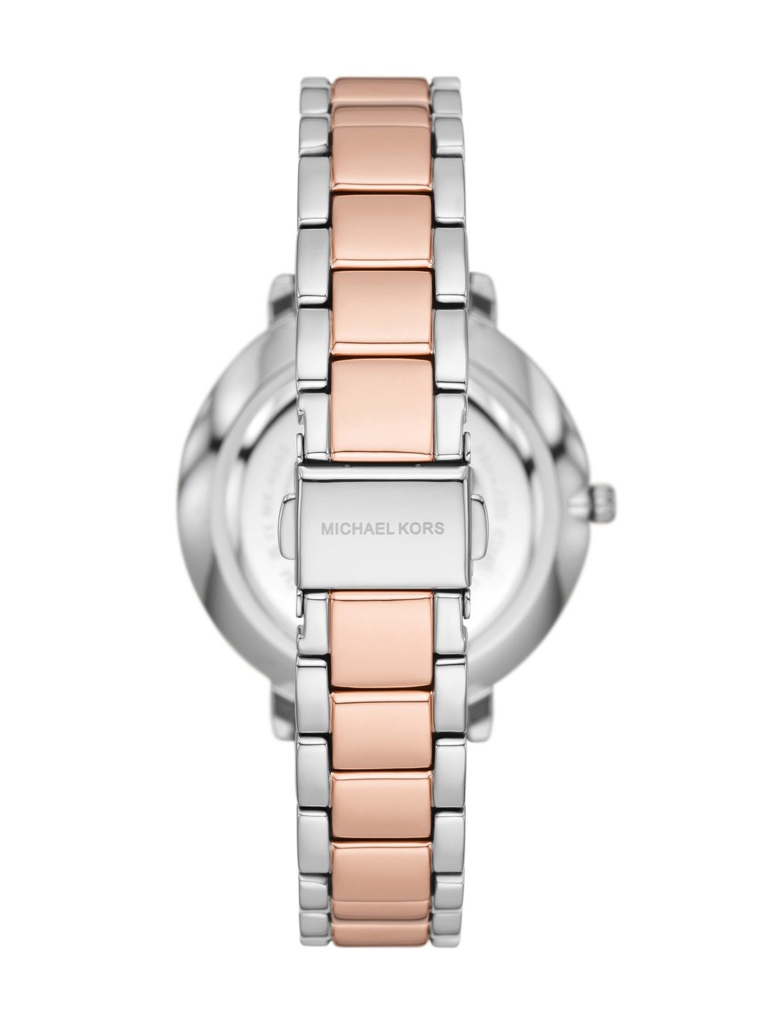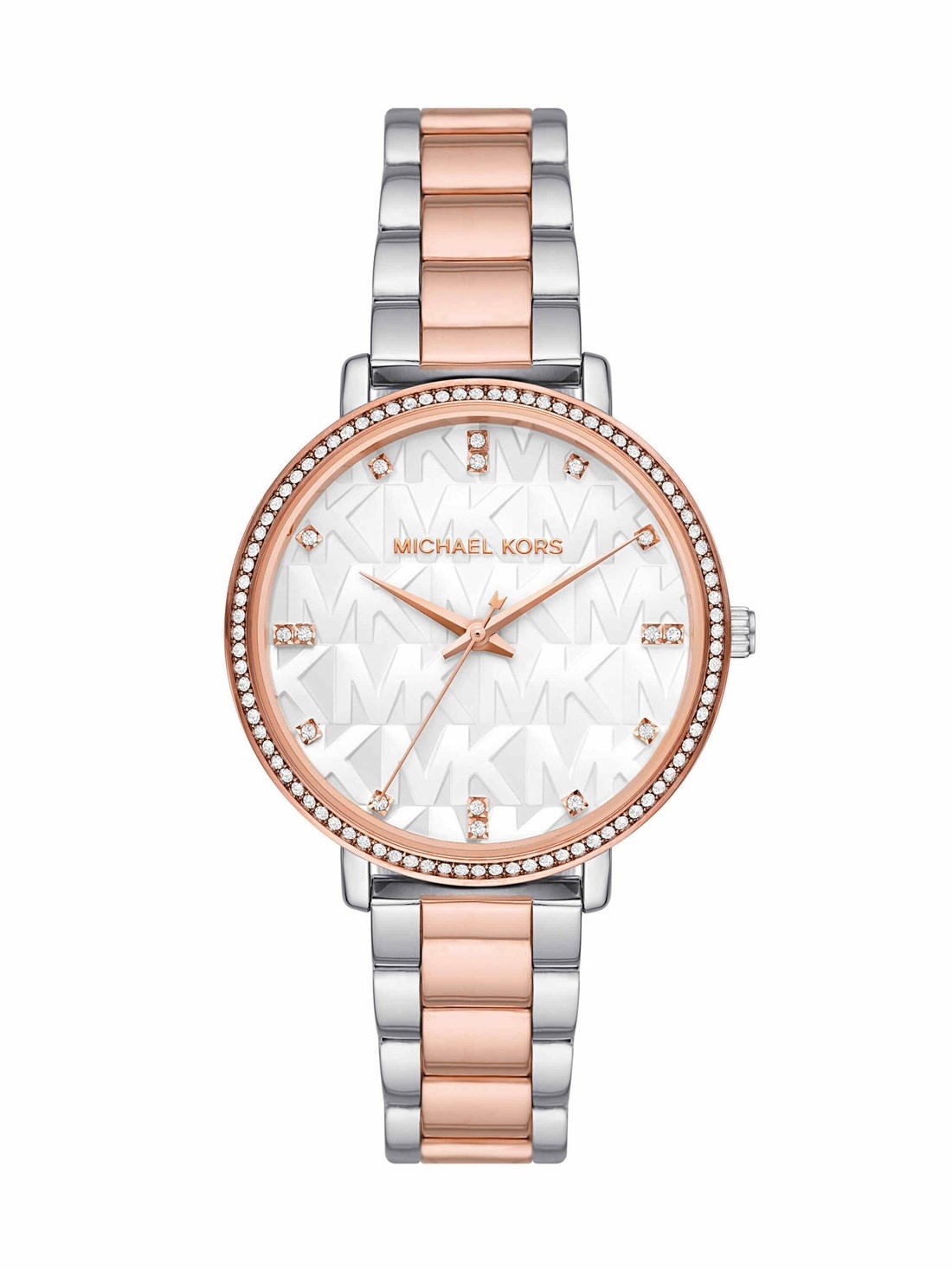 Watch Features mk, michael kors, michael kors watches for women, women's michael kors watches, stainless steel watches for women, silver and rose gold for women, two-tone watches for women, quartz three hand watches for women, pyper, japan, japanese movement, minimalist