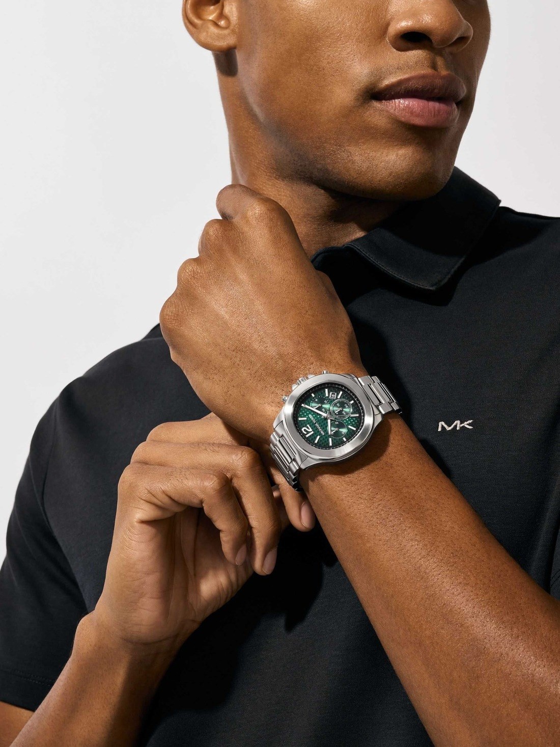 Short Description Michael Kors' 44mm Sage watch features a black and green brushed, polished and textured dial, chronograph movement and stainless steel bracelet.
