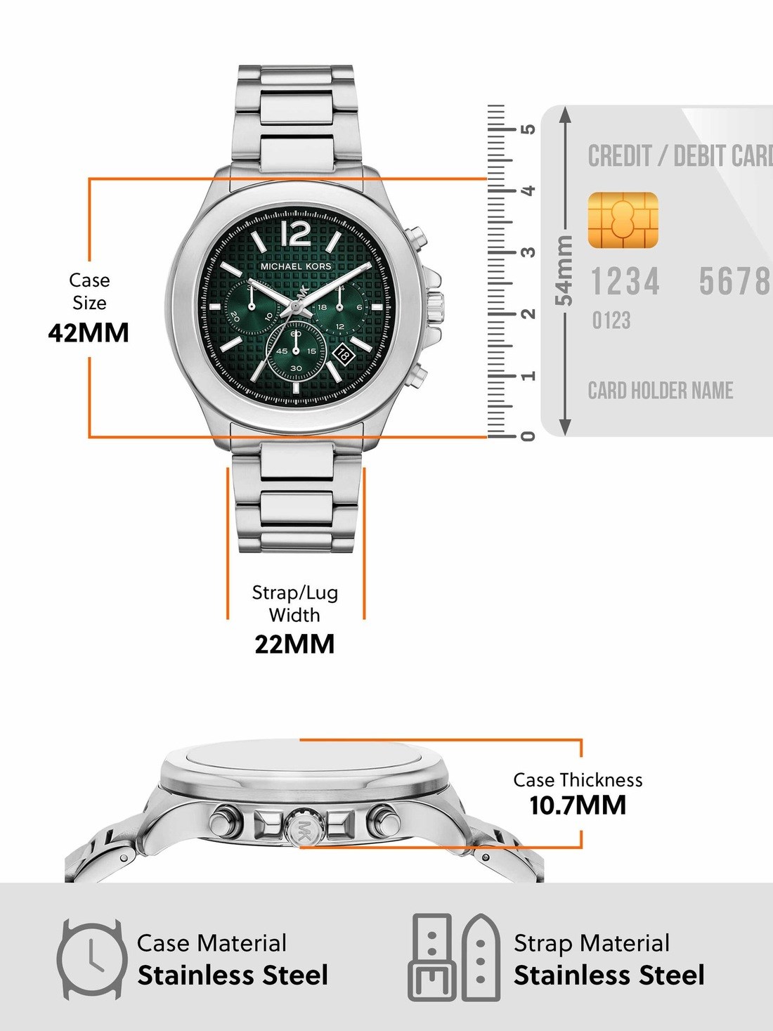 Watch Features mk, michael kors, michael kors watches for men, men's michael kors watches, stainless steel watches for men, silver watches for men, quartz chronograph watches for men, japan, japanese movement, sage