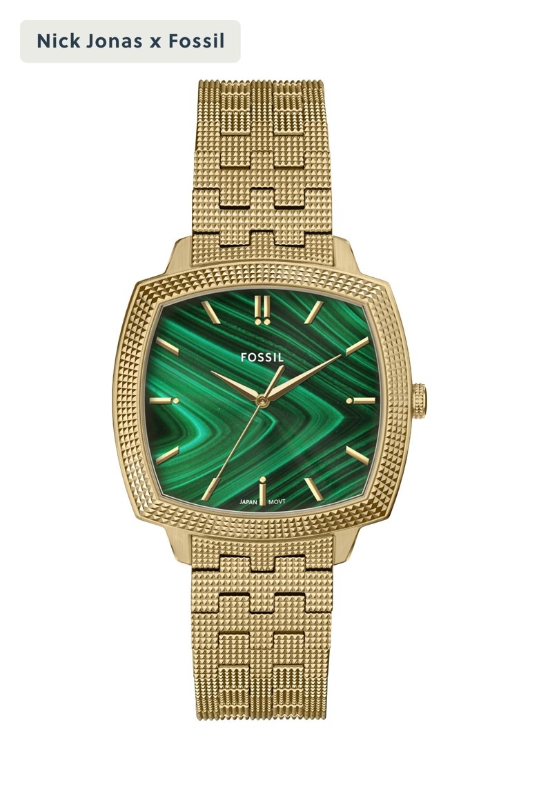 Watch Features fossil, fossil watches for unisex, unisex's fossil watches, stainless steel watches for unisex, quartz/3hand watches for unisex, gold-tone watches for unisex, machine luxe, japan, japan movement, nick jonas, shaped, numbered