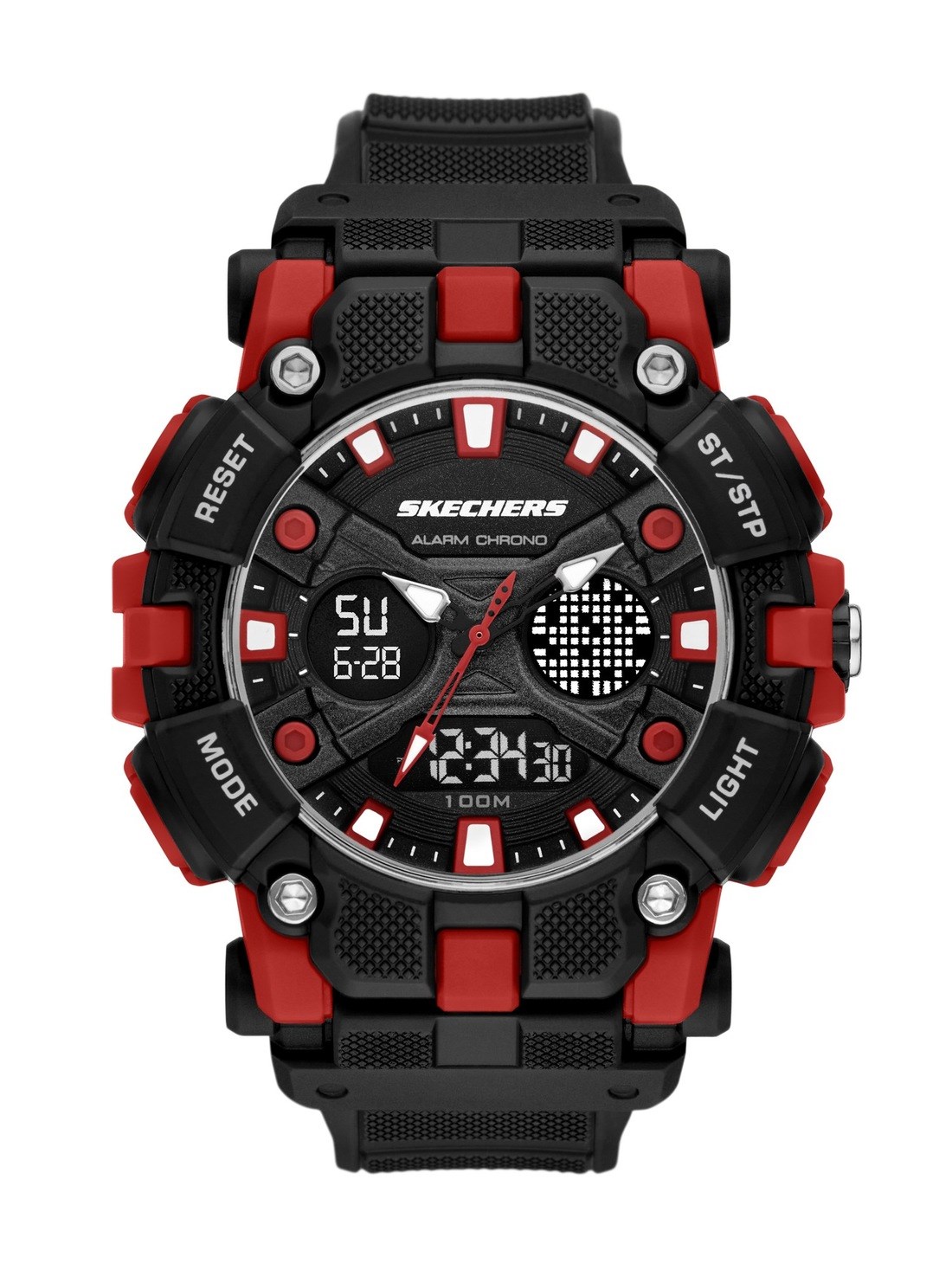 Short Description An oversized black case and strap set the tone for this analog-digital watch, highlighted by bold red accents and a layered combo dial for added dimension.