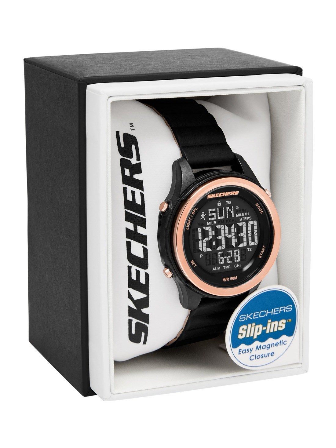 Short Description The digital pedometer movement pairs seamlessly with a negative display dial and a sleek, black silicone strap featuring a magnetic Skechers Slip-Ins band for convenience.