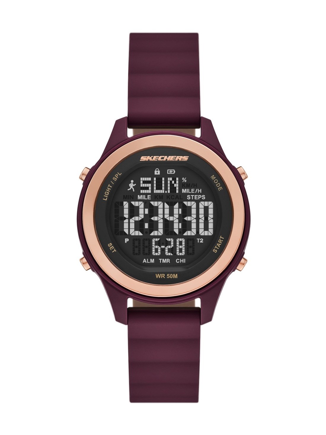Short Description This digital pedometer watch pairs a burgundy silicone strap with a coordinating round case, a negative display dial, and a magnetic Skechers Slip-Ins band.