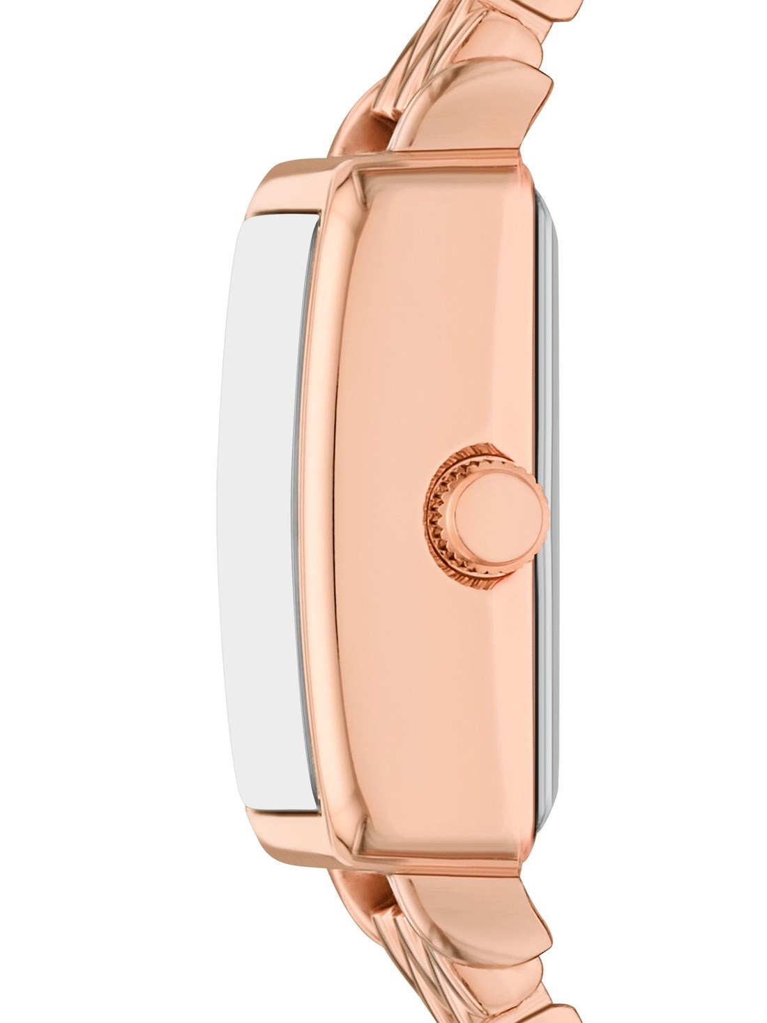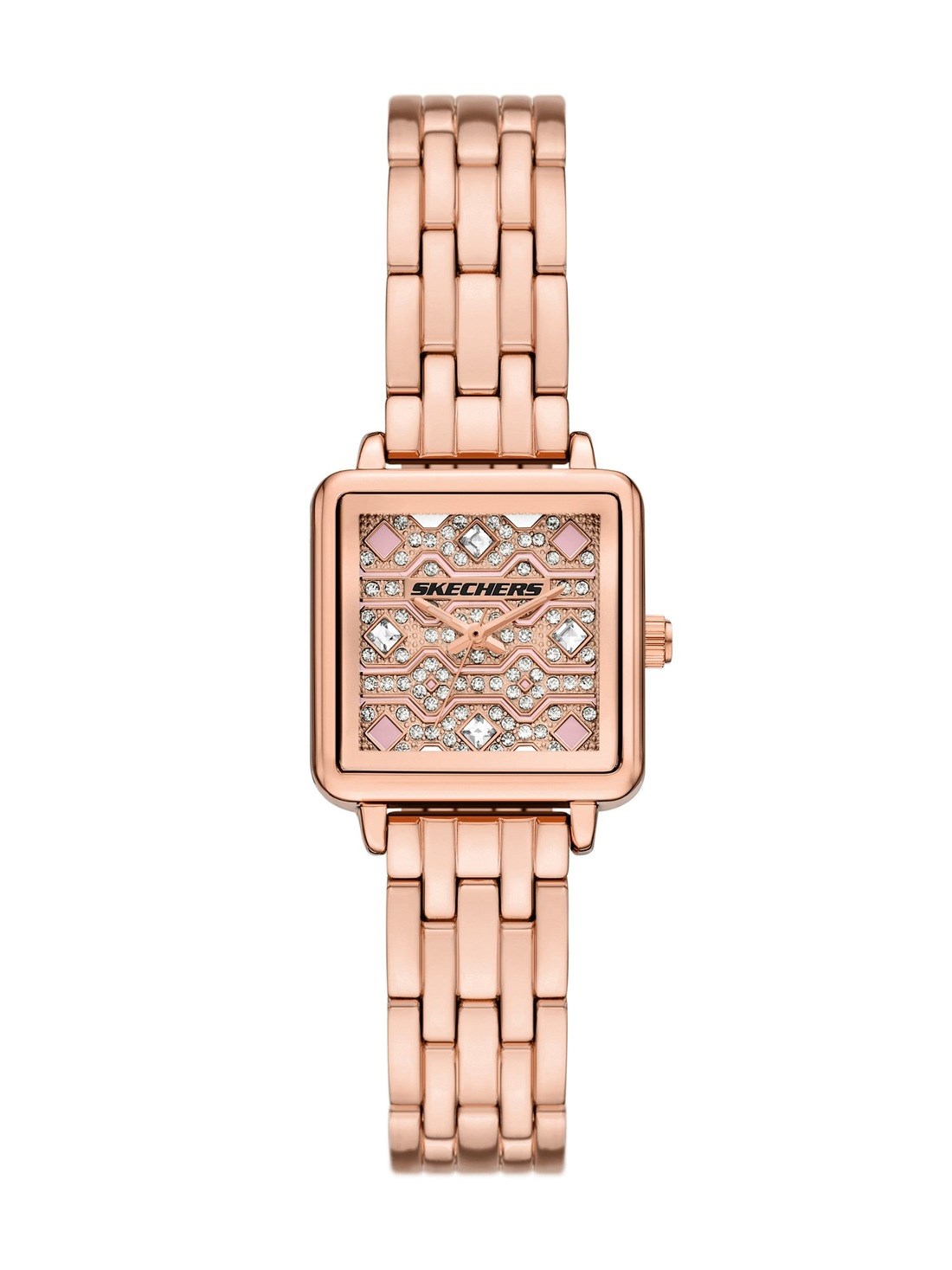 Short Description A square rose gold-tone case complements the pavé dial, where clear stones and subtle pink accents add dimension to the sleek metal bracelet design.